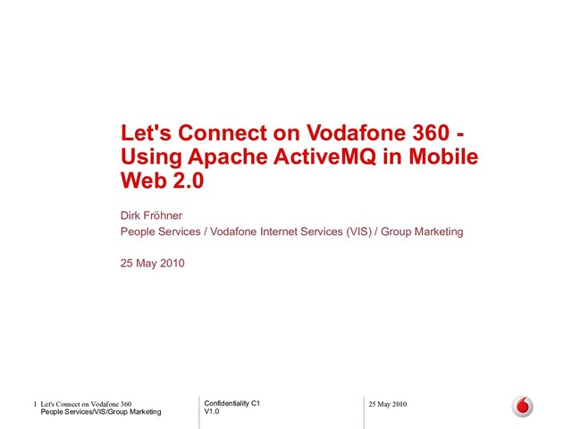 Vodafone 360 25 May 2010 Let's Connect on Vodafone 360 - Using Apache ActiveMQ in Mobile Web 2.0 Dirk Fröhner People Services / Vodafone Internet Services (VIS) / Group Marketing 25 May 2010