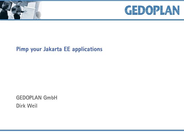 or similar REST API, CDI based business logic, JPA based persistence Demo: https://github.com/GEDOPLAN/pimp-jee.git 3 gedoplan.de Demo Pimp your Jakarta EE applications