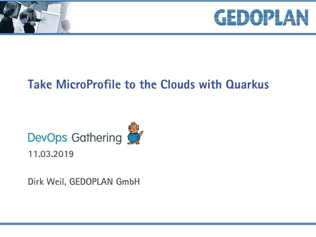 consulting, concepts, reviews GEDOPLAN IT Training Java, JEE, Tools etc. in Berlin, Bielefeld, on-site JEE since 1998 Speaker and author 2 gedoplan.de Take MicroProfile to the Clouds with Quarkus