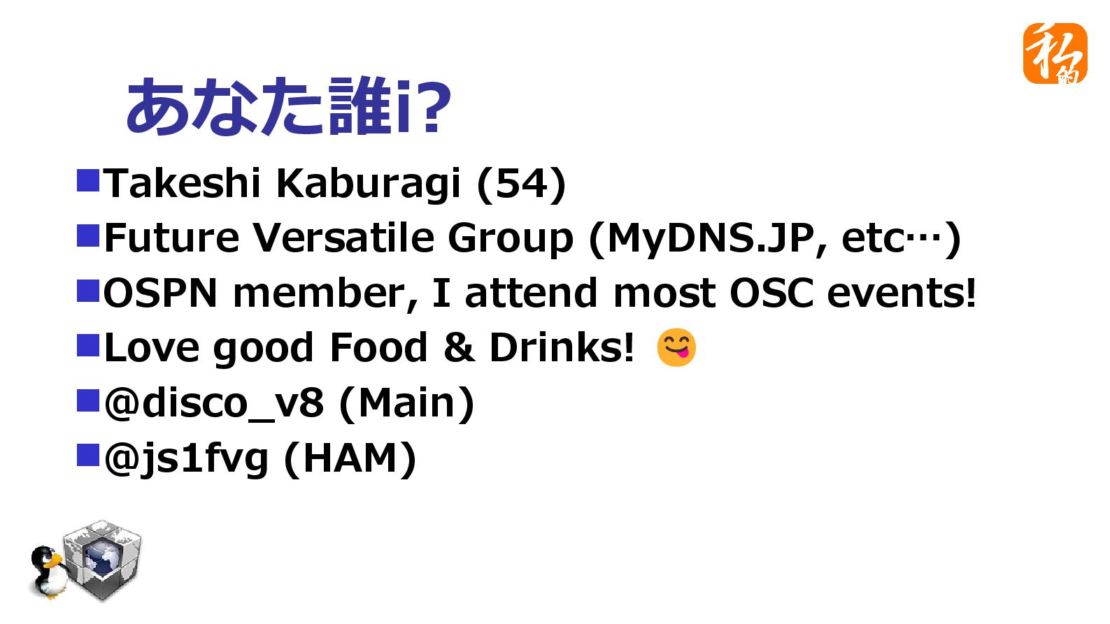 あなた誰i? Takeshi Kaburagi (54) Future Versatile Group (MyDNS.JP, etc…) OSPN