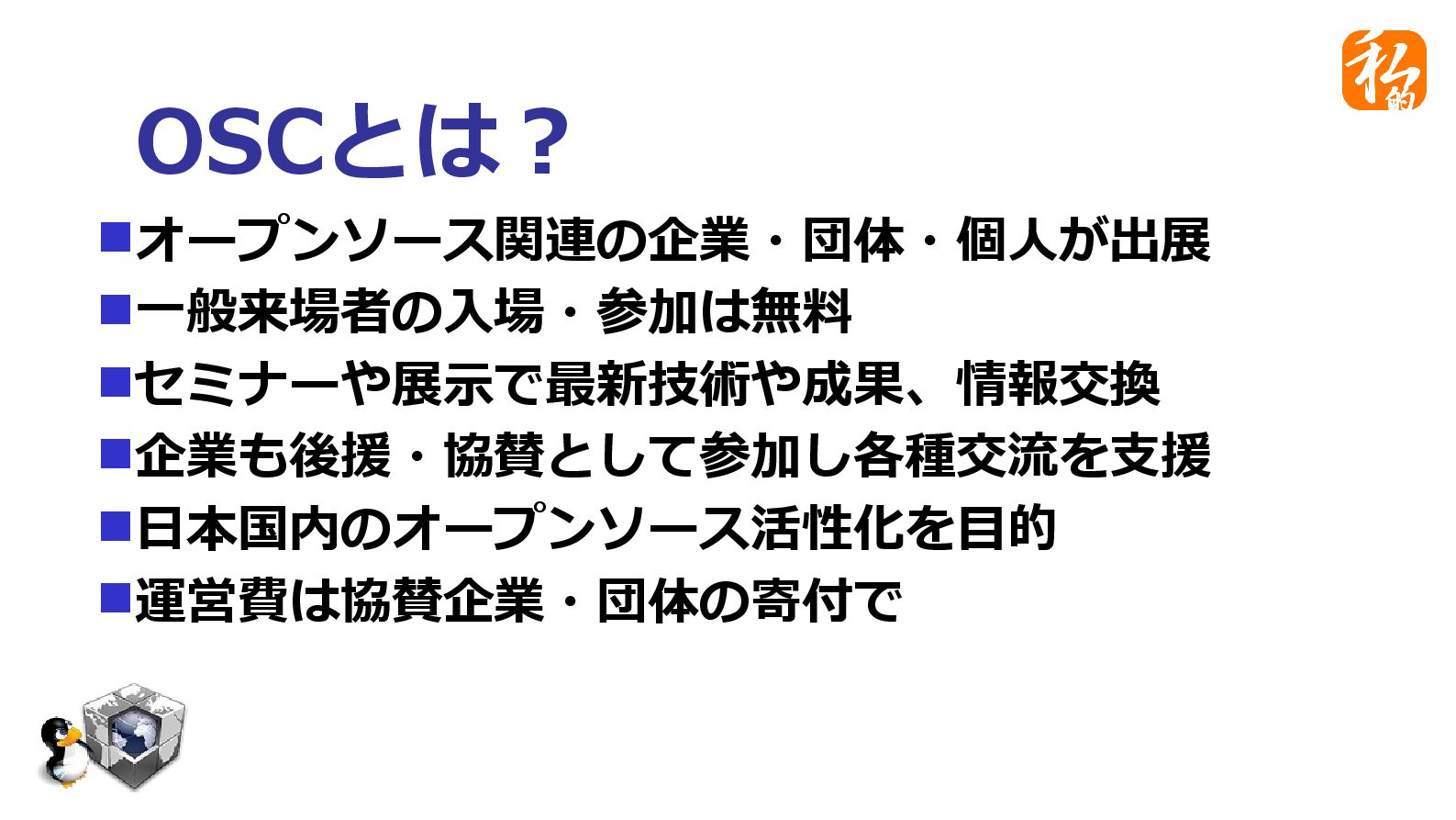 OSCとは? オープンソース関連の企業・団体・個人が出展 一般来場者の入場・参加は無料 セミナーや展示で最新技術や成果、情報交換 企業も後援・協賛として参加し各種交流を支援 日本国内のオープンソース活性化を目的 運営費は協賛企業・団体の寄付で