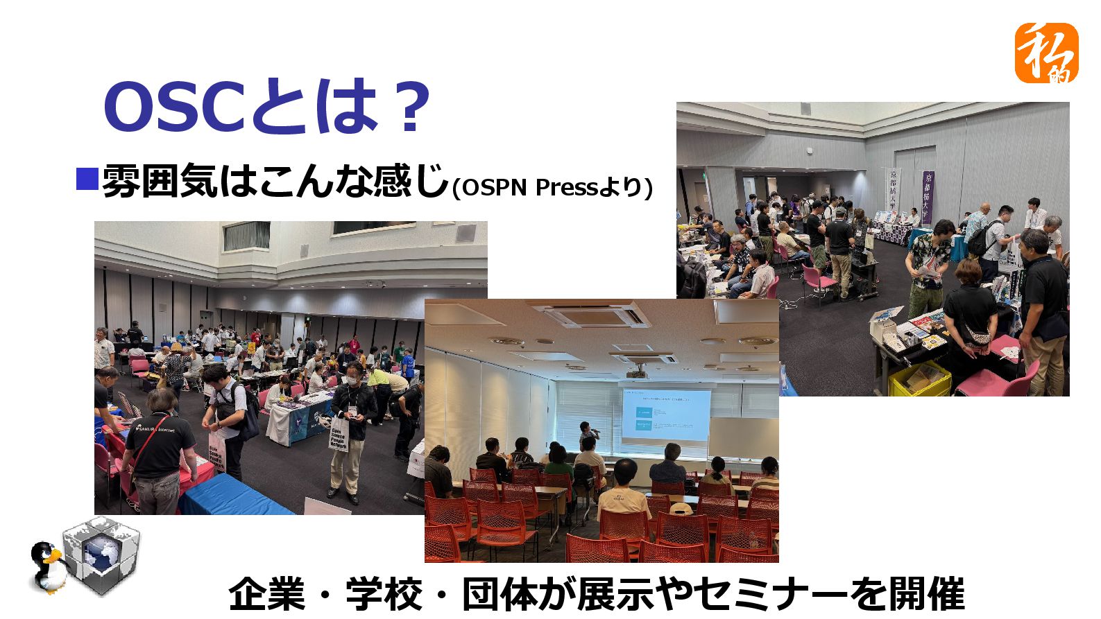 OSCとは? 雰囲気はこんな感じ(OSPN Pressより) 企業・学校・団体が展示やセミナーを開催