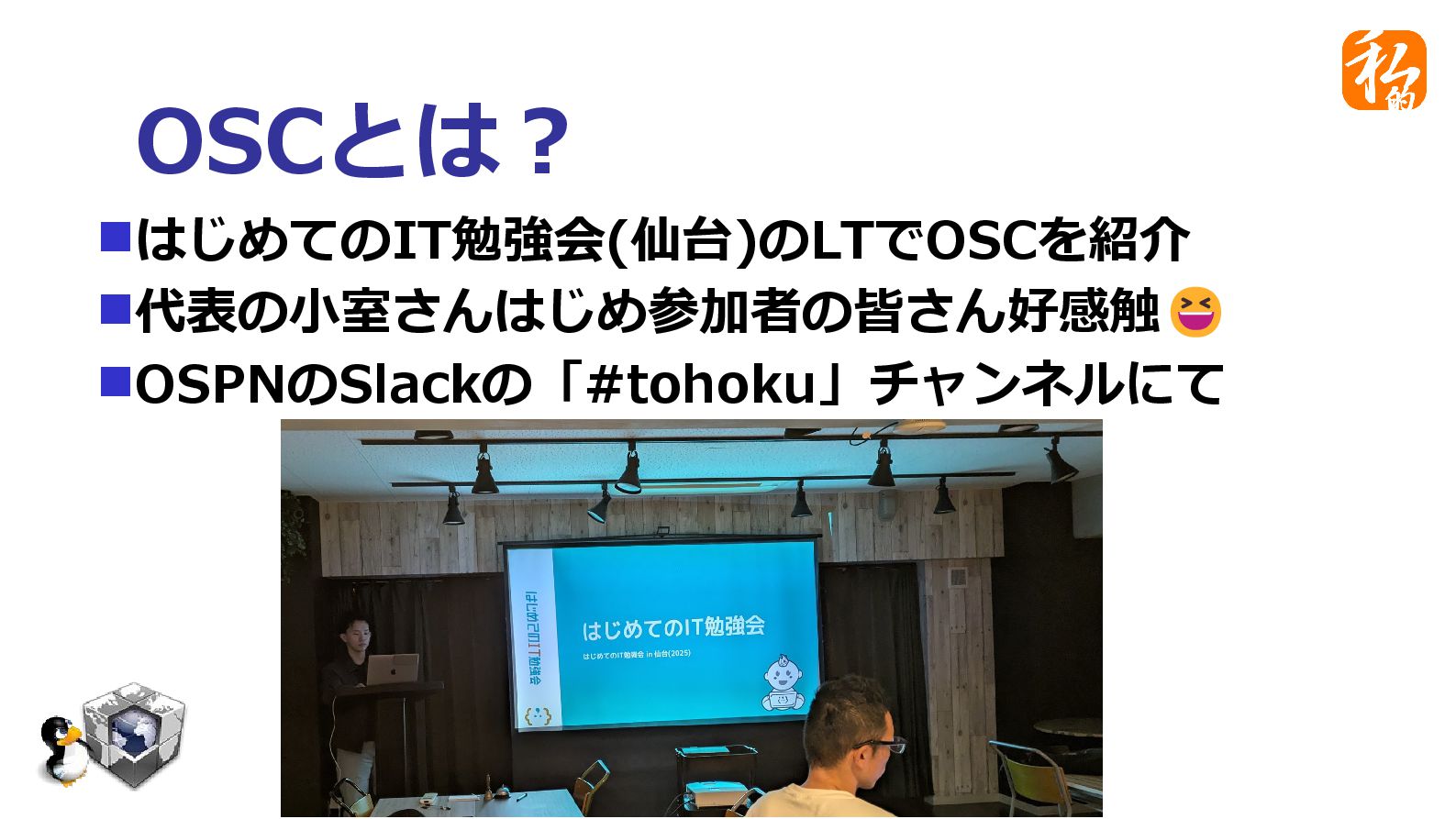 OSCとは? はじめてのIT勉強会(仙台)のLTでOSCを紹介 代表の小室さんはじめ参加者の皆さん好感触 😆 OSPNのSlackの「#tohoku」チャンネルにて