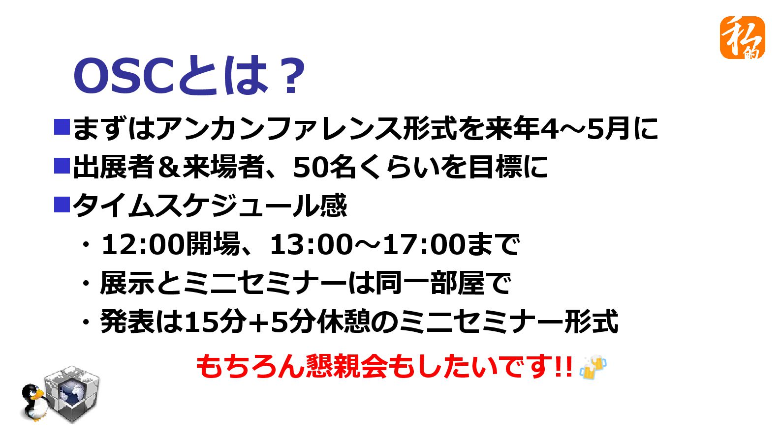 OSCとは? まずはアンカンファレンス形式を来年4~5月に 出展者&来場者、50名くらいを目標に タイムスケジュール感 ・12:00開場、13:00~17:00まで ・展示とミニセミナーは同一部屋で ・発表は15分+5分休憩のミニセミナー形式 もちろん懇親会もしたいです!! 🍻