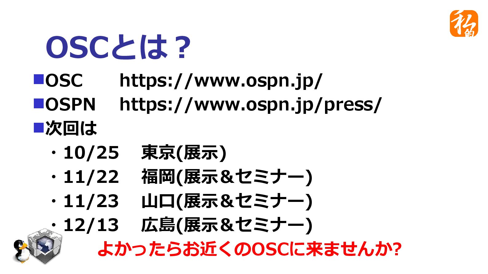 OSCとは? OSC https://www.ospn.jp/ OSPN https://www.ospn.jp/press/ 次回は ・10/25 東京(展示) ・11/22 福岡(展示&セミナー)