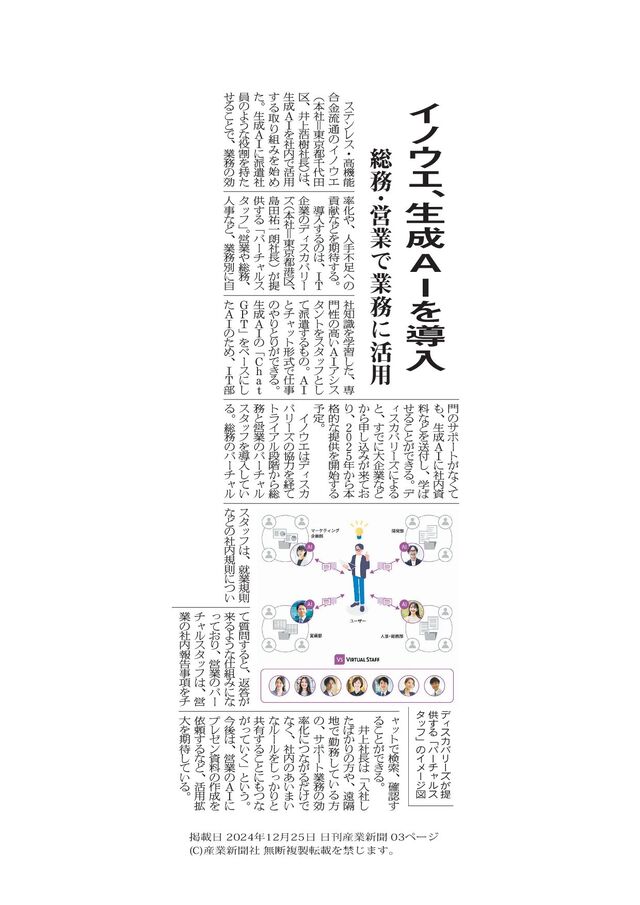 ಋ ೖ ૯ ɾ Ӧ ۀ Ͱ ۀ ʹ ׆ ༻ ε ς ϯ Ϩ ε ɾ ߴ ػ ೳ ߹ ۚ ྲྀ ௨ ͷ Π ϊ Τ ớ ຊ ࣾ ử ౦ ژ ઍ ా ۠ ỏ Ҫ ্ ߒ थ ࣾ Ờ ỏ ੜ ̖ ̞ Λ ࣾ Ͱ ׆ ༻ ͢ Δ औ Γ Έ Λ ࢝ Ί ͨ Ố ੜ ̖ ̞ ʹ ݣ ࣾ һ ͷ Α ͏ ͳ ׂ Λ ࣋ ͨ ͤ Δ ͜ ͱ Ͱ ỏ ۀ ͷ ޮ Խ ỏ ਓ ख ෆ ͷ ߩ ݙ ͳ Ͳ Λ ظ ͢ Δ Ố ಋ ೖ ͢ Δ ͷ ỏ ̞ ̩ ا ۀ ͷ σ ỹ ε Χ ό Ϧ ồ ζ ớ ຊ ࣾ ử ౦ ژ ߓ ۠ ỏ ౡ ా ༞ Ұ ࿕ ࣾ Ờ ͕ ఏ ڙ ͢ Δ ủ ό ồ ν Ỿ ϧ ε λ ỽ ϑ Ứ Ố Ӧ ۀ ૯ ỏ ਓ ࣄ ͳ Ͳ ỏ ۀ ผ ʹ ࣗ ࣾ ࣝ Λ ֶ श ͠ ͨ ỏ ઐ ੑ ͷ ߴ ͍ ̖ ̞ Ξ γ ε λ ϯ τ Λ ε λ ỽ ϑ ͱ ͠ ͯ ݣ ͢ Δ ͷ Ố ̖ ̞ ͱ ν Ỿ ỽ τ ܗ ࣜ Ͱ ࣄ ͷ Γ ͱ Γ ͕ Ͱ ͖ Δ Ố ੜ ̖ ̞ ͷ ủ ̘ ̷ ̰ ̓ ̜ ̥ ̩ Ứ Λ ϕ ồ ε ʹ ͠ ͨ ̖ ̞ ͷ ͨ Ί ỏ ̞ ̩ ෦ ͷ α ϙ ồ τ ͕ ͳ ͘ ͯ ỏ ੜ ̖ ̞ ʹ ࣾ ࢿ ྉ ͳ Ͳ Λ ૹ ͠ ỏ ֶ ͤ Δ ͜ ͱ ͕ Ͱ ͖ Δ Ố σ ỹ ε Χ ό Ϧ ồ ζ ʹ Α Δ ͱ ỏ ͢ Ͱ ʹ େ ا ۀ ͳ Ͳ ͔ Β ਃ ͠ ࠐ Έ ͕ དྷ ͯ ͓ Γ ỏ ⚒ ⚐ ⚒ ⚕ ͔ Β ຊ ֨ త ͳ ఏ ڙ Λ ։ ࢝ ͢ Δ ༧ ఆ Ố Π ϊ Τ σ ỹ ε Χ ό Ϧ ồ ζ ͷ ڠ ྗ Λ ܦ ͯ τ ϥ Π Ξ ϧ ஈ ֊ ͔ Β ૯ ͱ Ӧ ۀ ͷ ό ồ ν Ỿ ϧ ε λ ỽ ϑ Λ ಋ ೖ ͠ ͯ ͍ Δ Ố ૯ ͷ ό ồ ν Ỿ ϧ ε λ ỽ ϑ ỏ ब ۀ ن ଇ ͳ Ͳ ͷ ࣾ ن ଇ ʹ ͭ ͍ ͯ ࣭ ͢ Δ ͱ ỏ ฦ ͕ དྷ Δ Α ͏ ͳ Έ ʹ ͳ ỳ ͯ ͓ Γ ỏ Ӧ ۀ ͷ ό ồ ν Ỿ ϧ ε λ ỽ ϑ ỏ Ӧ ۀ ͷ ࣾ ใ ࠂ ࣄ ߲ Λ ν Ỿ ỽ τ Ͱ ݕ ࡧ ỏ ֬ ೝ ͢ Δ ͜ ͱ ͕ Ͱ ͖ Δ Ố Ҫ ্ ࣾ ủ ೖ ࣾ ͠ ͨ ͔ Γ ͷ ํ ỏ ԕ ִ Ͱ ۈ ͠ ͯ ͍ Δ ํ ͷ ỏ α ϙ ồ τ ۀ ͷ ޮ Խ ʹ ͭ ͳ ͕ Δ ͩ ͚ Ͱ ͳ ͘ ỏ ࣾ ͷ ͋ ͍ · ͍ ͳ ϧ ồ ϧ Λ ͠ ỳ ͔ Γ ͱ ڞ ༗ ͢ Δ ͜ ͱ ʹ ͭ ͳ ͕ ỳ ͯ ͍ ͘ Ứ ͱ ͍ ͏ Ố ࠓ ޙ ỏ Ӧ ۀ ͷ ̖ ̞ ʹ ϓ Ϩ θ ϯ ࢿ ྉ ͷ ࡞ Λ ґ པ ͢ Δ ͳ Ͳ ỏ ׆ ༻ ֦ େ Λ ظ ͠ ͯ ͍ Δ Ố σ ỹ ε Χ ό Ϧ ồ ζ ͕ ఏ ڙ ͢ Δ ủ ό ồ ν Ỿ ϧ ε λ ỽ ϑ Ứ ͷ Π ϝ ồ δ ਤ 掲載日 2024年12月25日 日刊産業新聞 03ページ (C)産業新聞社 無断複製転載を禁じます。