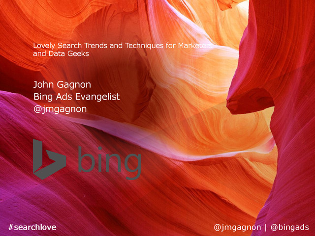 and descriptions: Discounts, special packages Important keywords Event specific keywords Inventory: Hold onto inventory, create special packages Cross-Channel: Align timing of demand generating media retargeting, social Bids/budget: Make sure your budget is robust | #searchlove @jmgagnon | @bingads