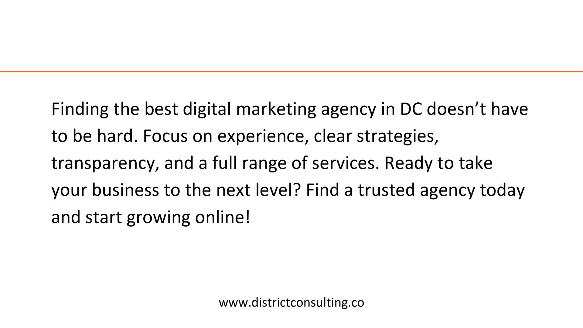 to be hard. Focus on experience, clear strategies, transparency, and a full range of services. Ready to take your business to the next level? Find a trusted agency today and start growing online! www.districtconsulting.co