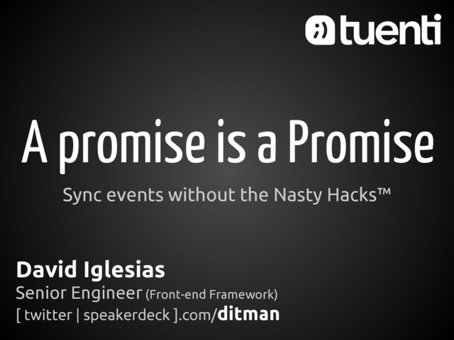 Composed of 2 parts ◦ Promise (handles event subscriptions) ◦ Resolver (decides if the promise was success / fail) • Synchronization mechanisms ◦ all, any, some, chain ... Deferred to the rescue! (when.js) ...and they have been around since the '70s!