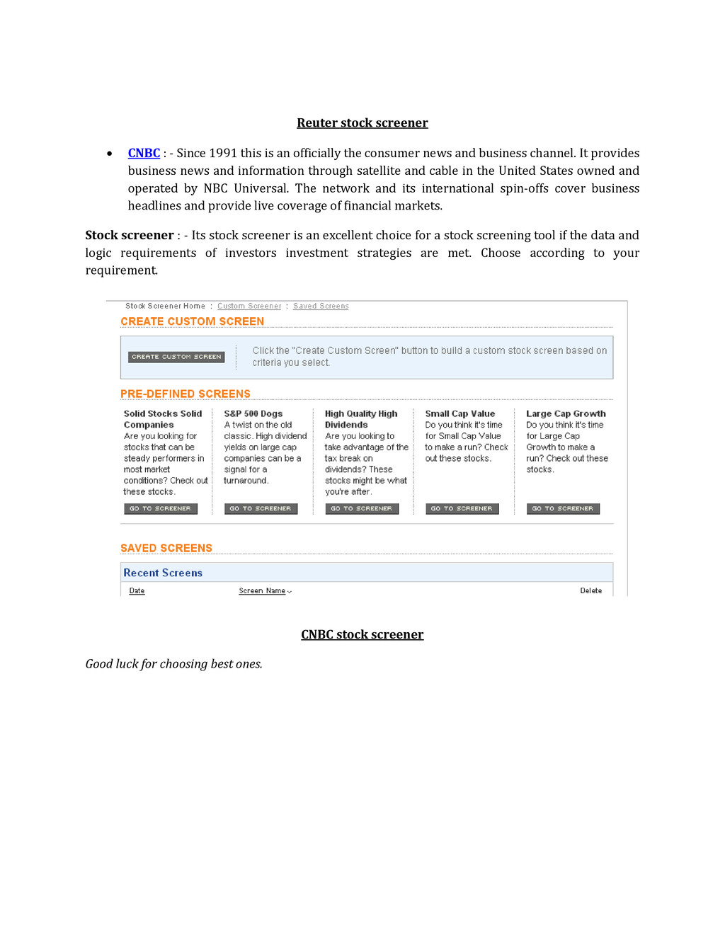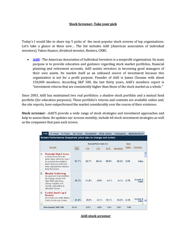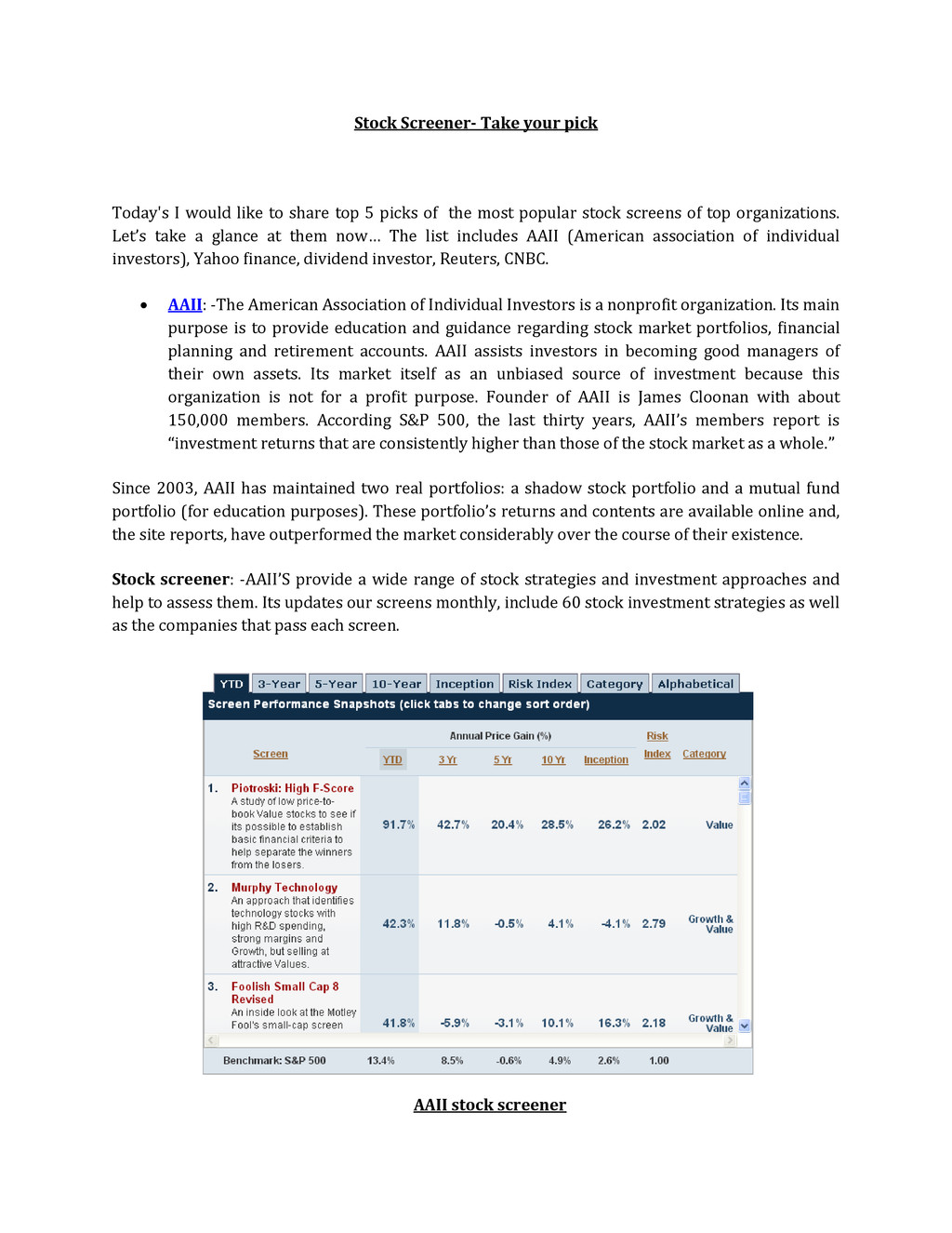 Today's I would like to share top 5 picks of the most popular stock screens of top organizations. Let’s take a glance at them now… The list includes AAII (American association of individual investors), Yahoo finance, dividend investor, Reuters, CNBC.