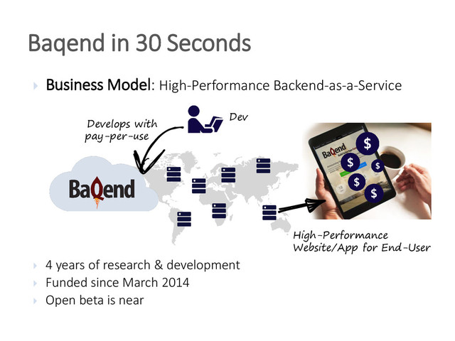 & development Funded since March 2014 Open beta is near Baqend in 30 Seconds High-Performance Website/App for End-User Develops with pay-per-use Dev