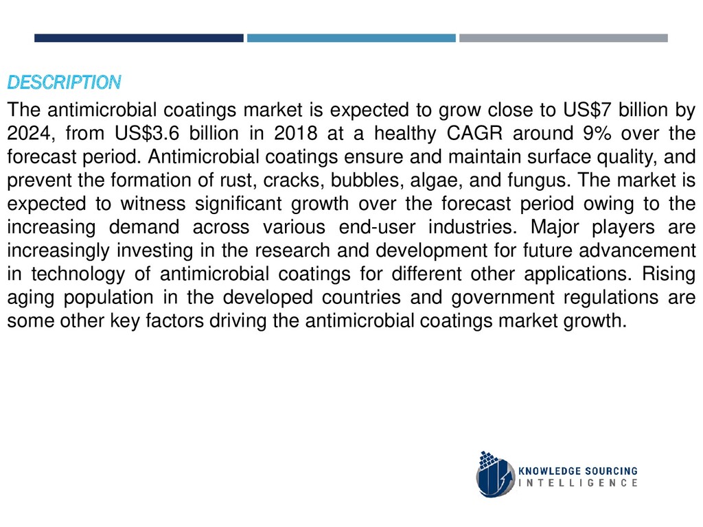 The antimicrobial coatings market is expected to grow close to US$7 billion by 2024, from US$3.6 billion in 2018 at a healthy CAGR around 9% over the forecast