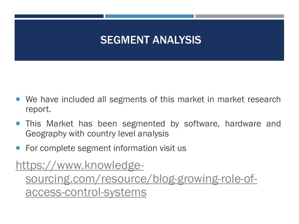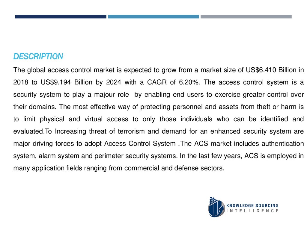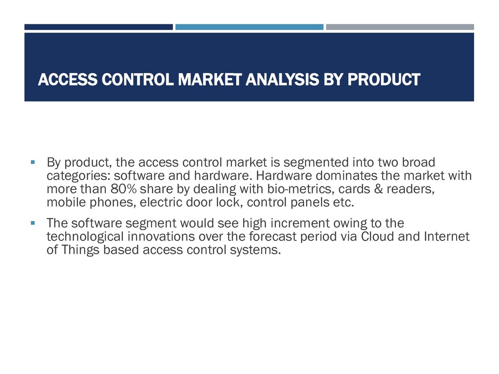 way of protecting personnel and assets from theft or harm is to limit physical and virtual access to only those individuals who can be identified and evaluated.The access control market is segmented into two broad categories: software and hardware.