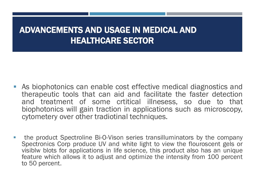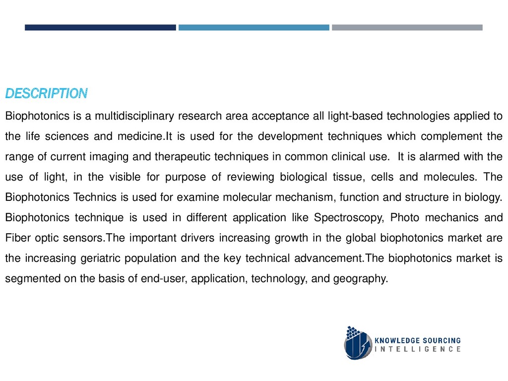 Biophotonics is a multidisciplinary research area acceptance all light-based technologies applied to the life sciences and medicine. It is used for the development techniques which complement the range of current imaging and therapeutic techniques in common clinical use. The biophotonics market