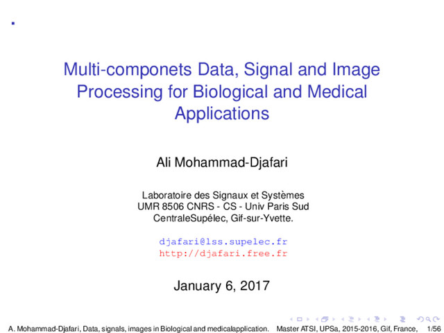 Individual cells, Population of cells, Small animals, Human In vitro and In Vivo A great number of data, variables, time series, signals, images, ... Genes expression, Hormones, temperature, ECG, EMG, ... Tomographic images (X rays, PET, SPECT, IRM), 3D body volume, fMRI, Holographic, multi- and Hyper-spectral images, ... Need for Visualization tools multicomponent, multivariate and multidimensional Time domain Transformed domain: Fourier, Wavelets, Time-Frequency... Scatter plots, histograms, statistics, ... A. Mohammad-Djafari, Data, signals, images in Biological and medicalapplication. Master ATSI, UPSa, 2015-2016, Gif, France, 2/56