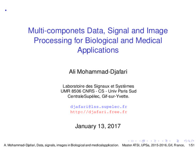 ◮ f(t) Variation of temperature in a given position as a function of time t ◮ f(x) Variation of temperature as a function of the position x on a line ◮ f(ν) Variation of temperature as a function of the frequency ν ◮ Image: f(x, y), f(x, t), f(ν, t), f(ν1 , ν2 ) ◮ f(x, y) Distribution of temperature as a function of the position (x, y) ◮ f(x, t) Variation of temperature as a function of x and t ◮ ... ◮ 3D, 3D+t, 3D+ν, ... signals: f(x, y, z), f(x, y, t), f(x, y, z, t) ◮ f(x, y, z) Distribution of temperature as a function of the position (x, y, z) ◮ f(x, y, z, t) Variation of temperature as a function of (x, y, z) and t ◮ ... A. Mohammad-Djafari, Data, signals, images in Biological and medicalapplication. Master ATSI, UPSa, 2015-2016, Gif, France, 5/51