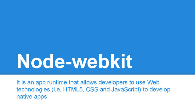 WebGL. • Complete support for Node.js APIs and third party modules (npm). • Good performance: Node and WebKit run in the same thread: Function calls are straight-forward; objects are in the same heap and can just reference each other. • Easy to package and distribute apps. • Available on Linux, Mac OS X and Windows.