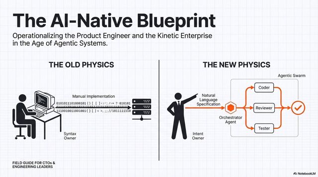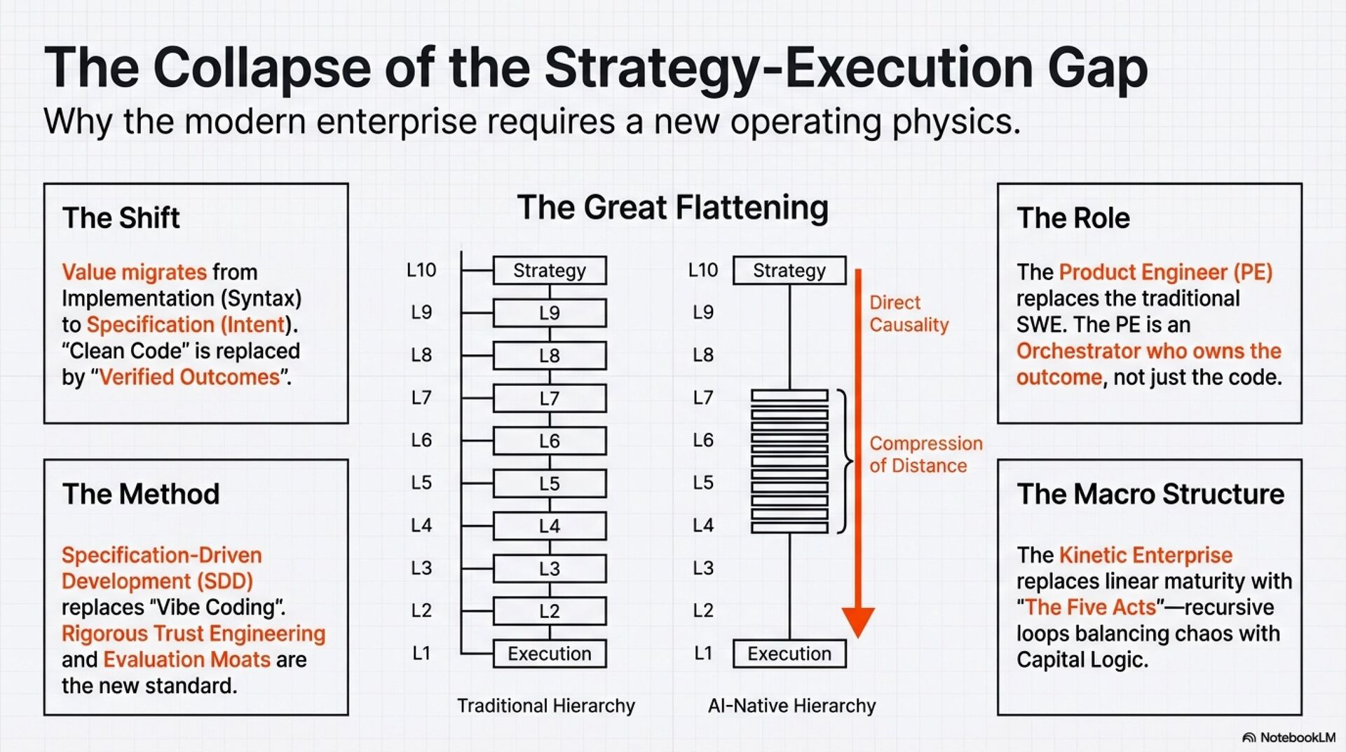 This deck argues that AI-native engineering changes the operating physics of the enterprise, because implementation work collapses and value shifts to intent, verification, and governed autonomy. The outcome is a flatter decision stack, a new dominant role (the Product Engineer), and a non-linear operating model (the Kinetic Enterprise).