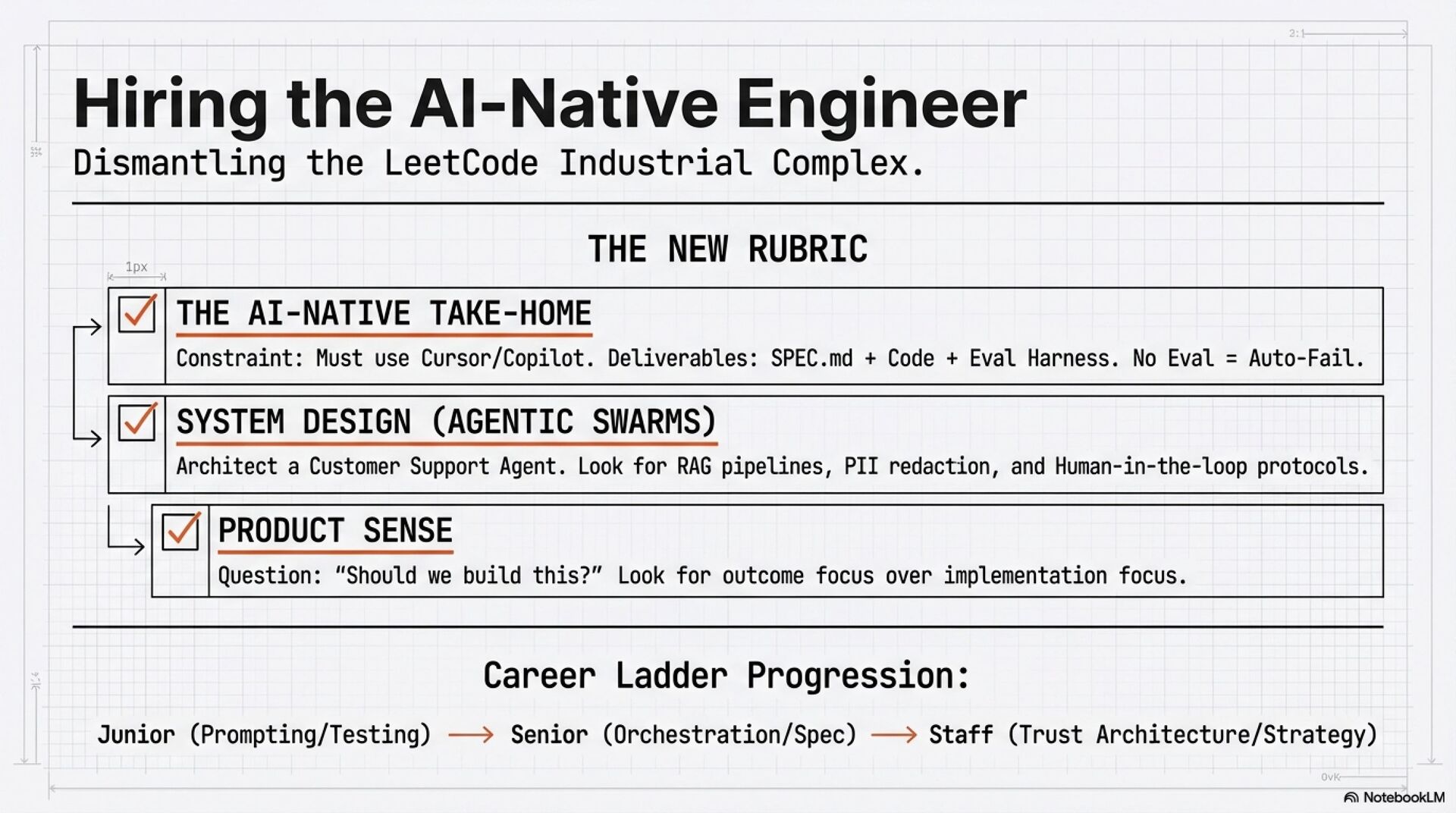 • Hiring shifts away from LeetCode toward an AI-native take-home (SPEC.md plus eval harness), agentic system design, and product sense (“should we build this”). Page 12.