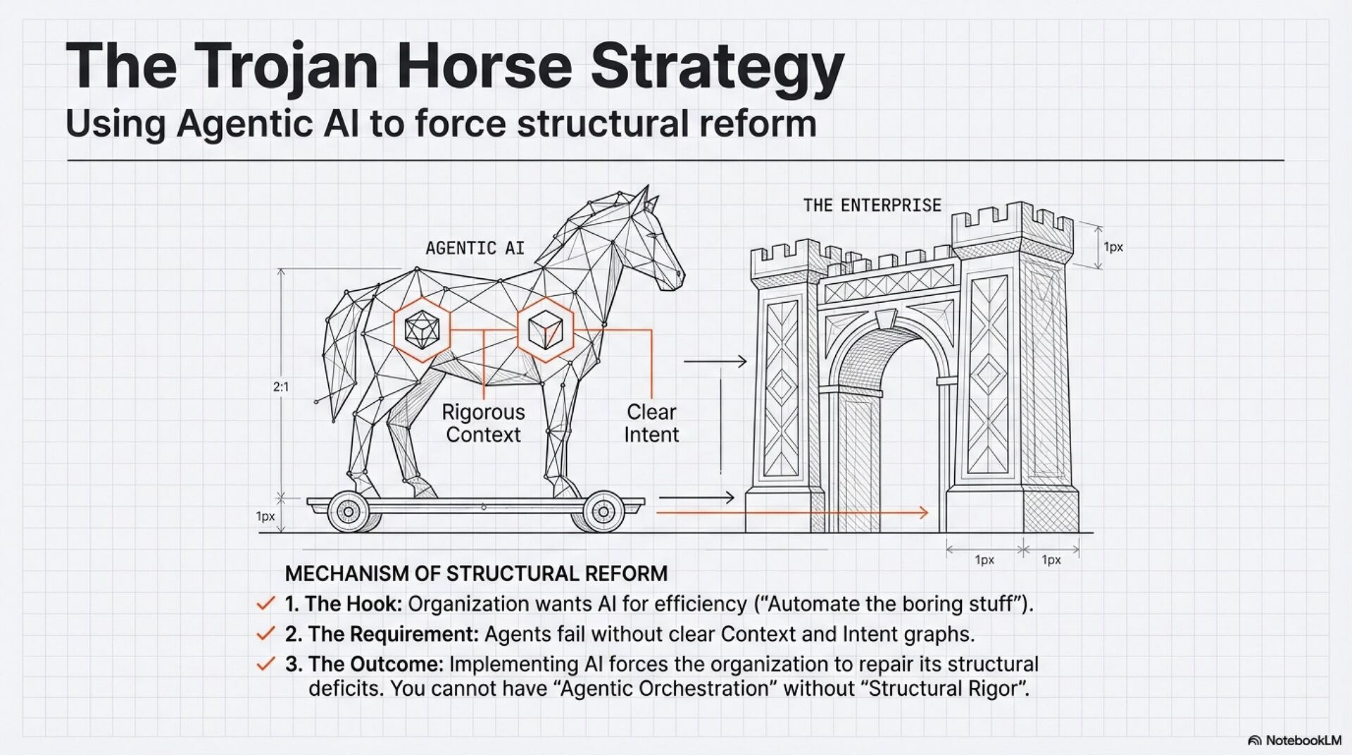 • Adoption can be forced through a “Trojan Horse Strategy”, leaders want efficiency, agents fail without clear context and intent, so implementation pressure drives structural rigor. Page 13.