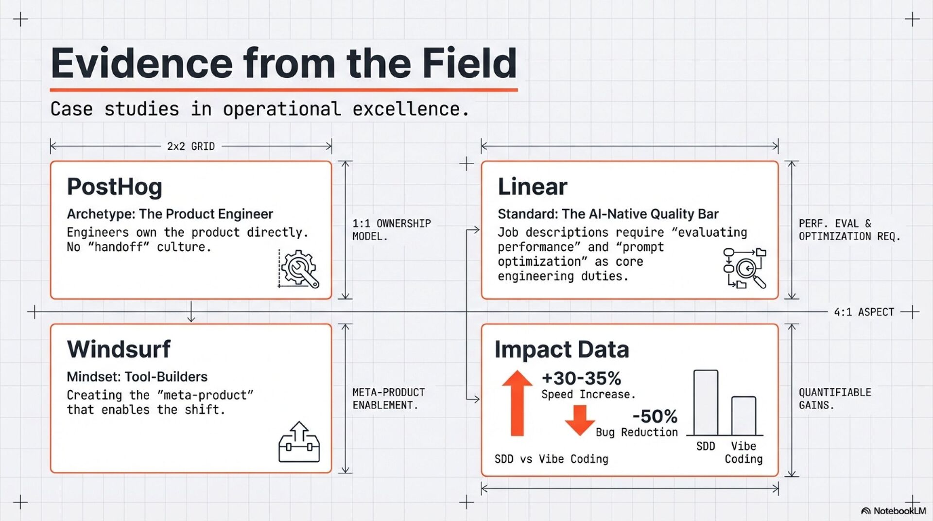 • Case-style evidence points to faster delivery when SDD replaces vibe coding, and to organizations where product engineers sit on the product with minimal handoff culture. Page 14.