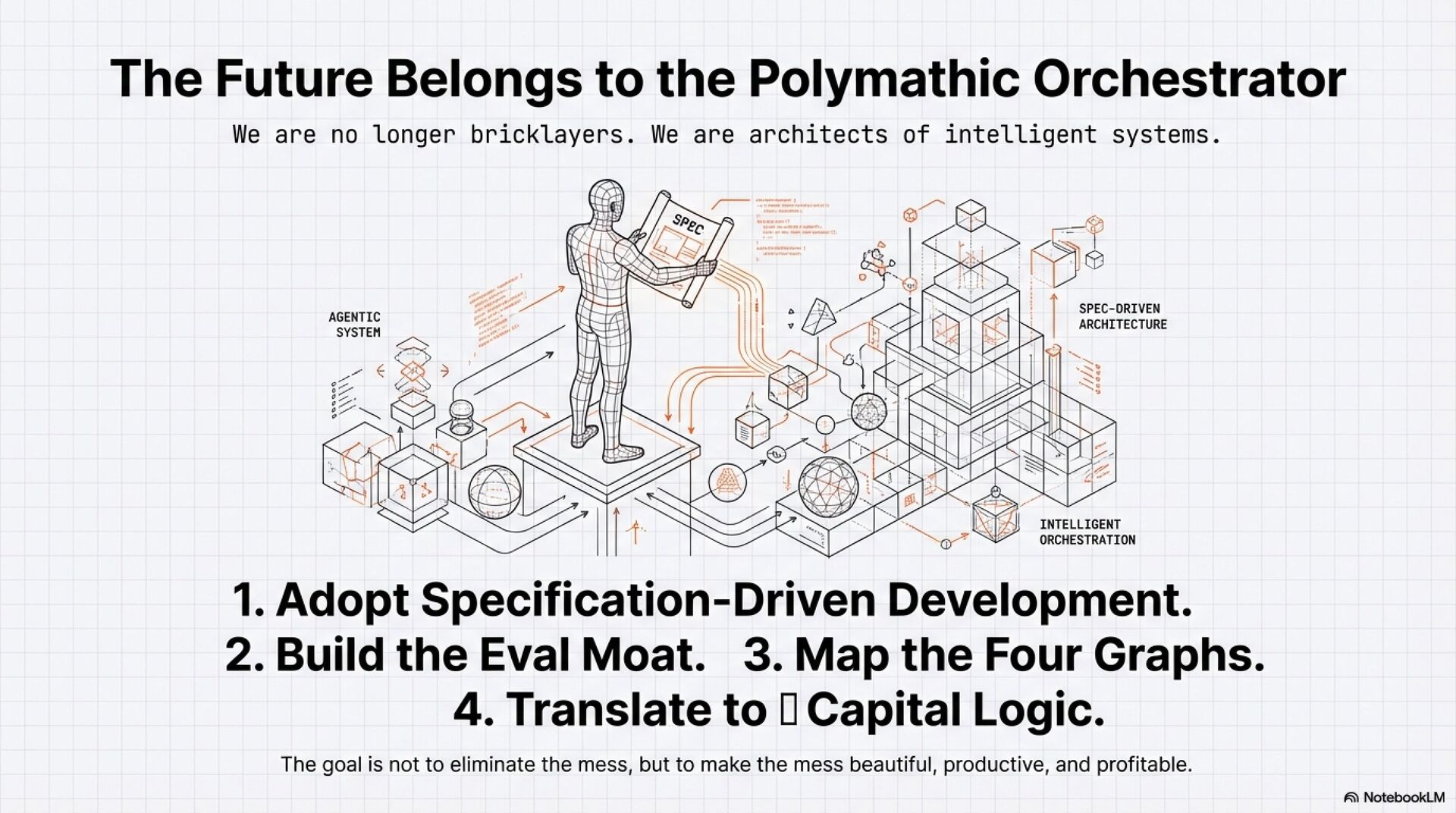 • The closing message reframes engineering identity: you become architects of intelligent systems, with a four-step call to action: adopt SDD, build the eval moat, map the four graphs, translate to capital logic. Page 15.