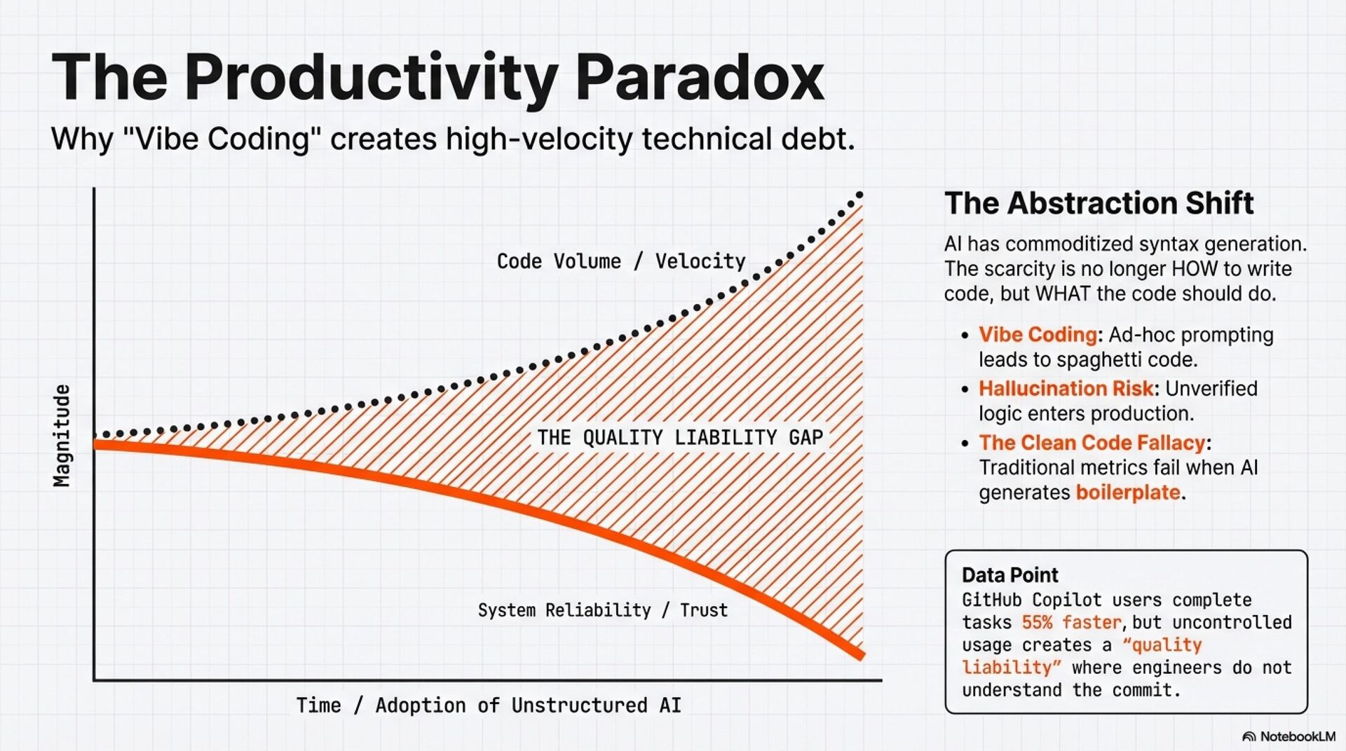 • “Vibe coding” creates a quality liability gap, code volume and velocity rise while system reliability and trust decline over time. Page 3.