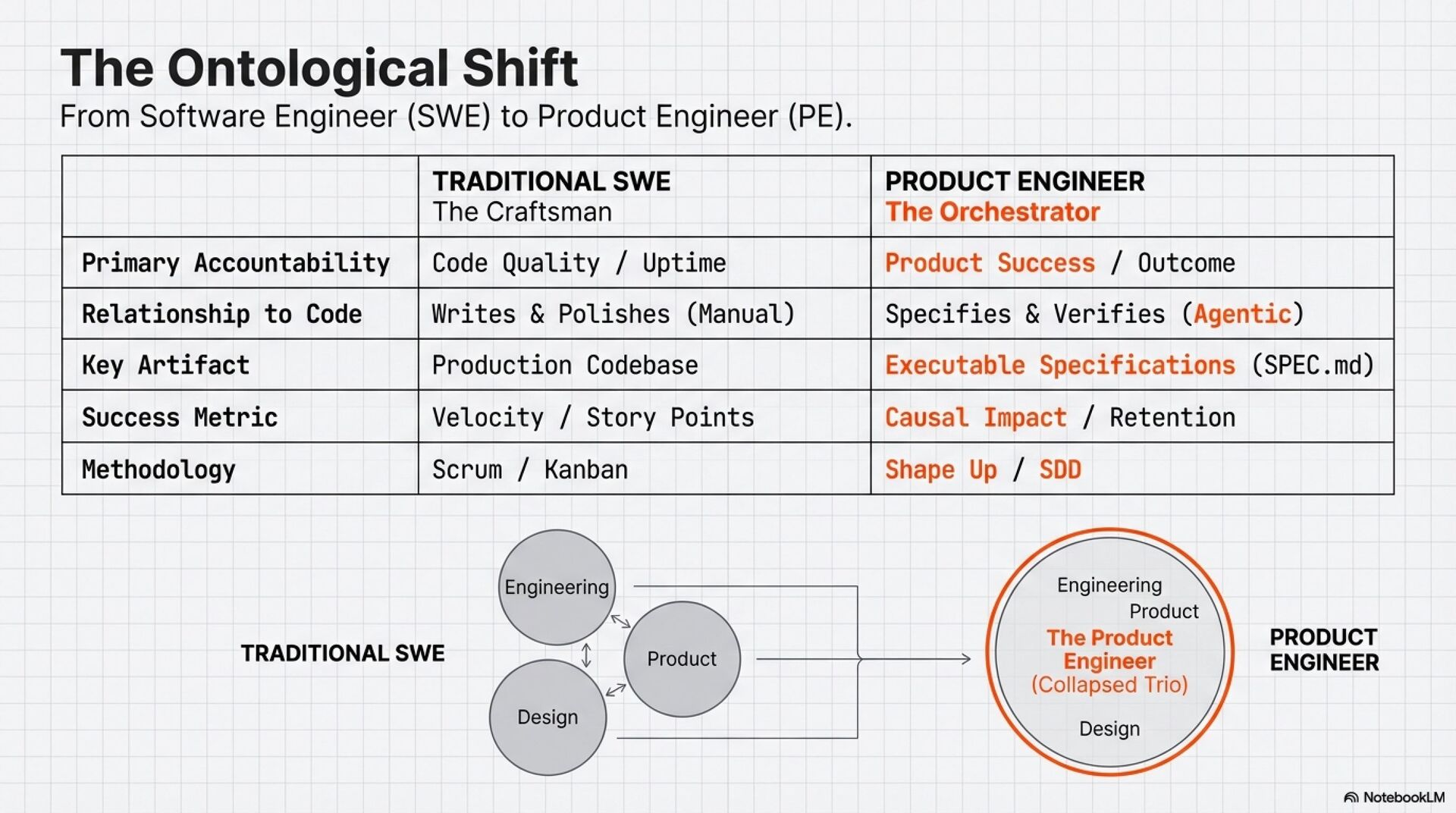 • The Product Engineer replaces the traditional SWE as the orchestrator who owns outcomes, not only code quality, and uses executable specifications as the primary artifact. Page 4.