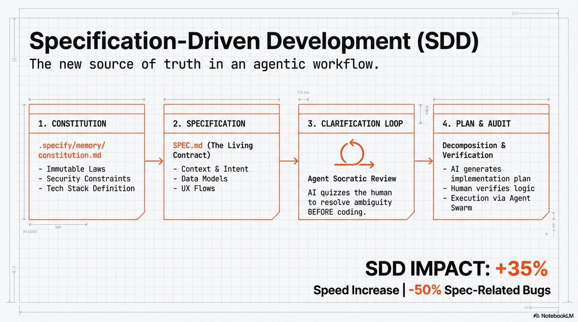 • SDD is presented as the new source of truth: Constitution, Specification, Clarification Loop, Plan and Audit, with explicit emphasis on agent Socratic review to resolve ambiguity before coding. Page 5.