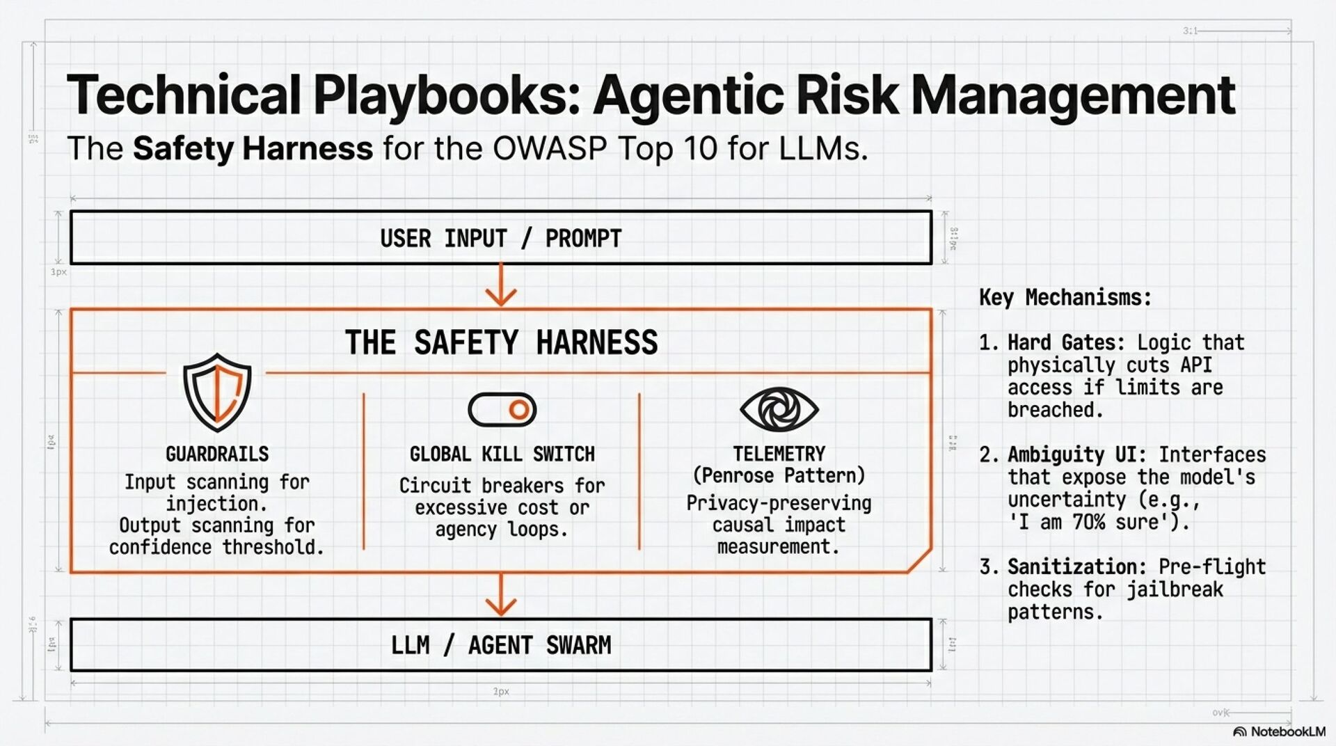 • The “Safety Harness” design includes guardrails, a global kill switch (circuit breakers for agency loops), and telemetry (privacy-preserving causal impact measurement), tied to OWASP Top 10 for LLMs framing. Page 7.