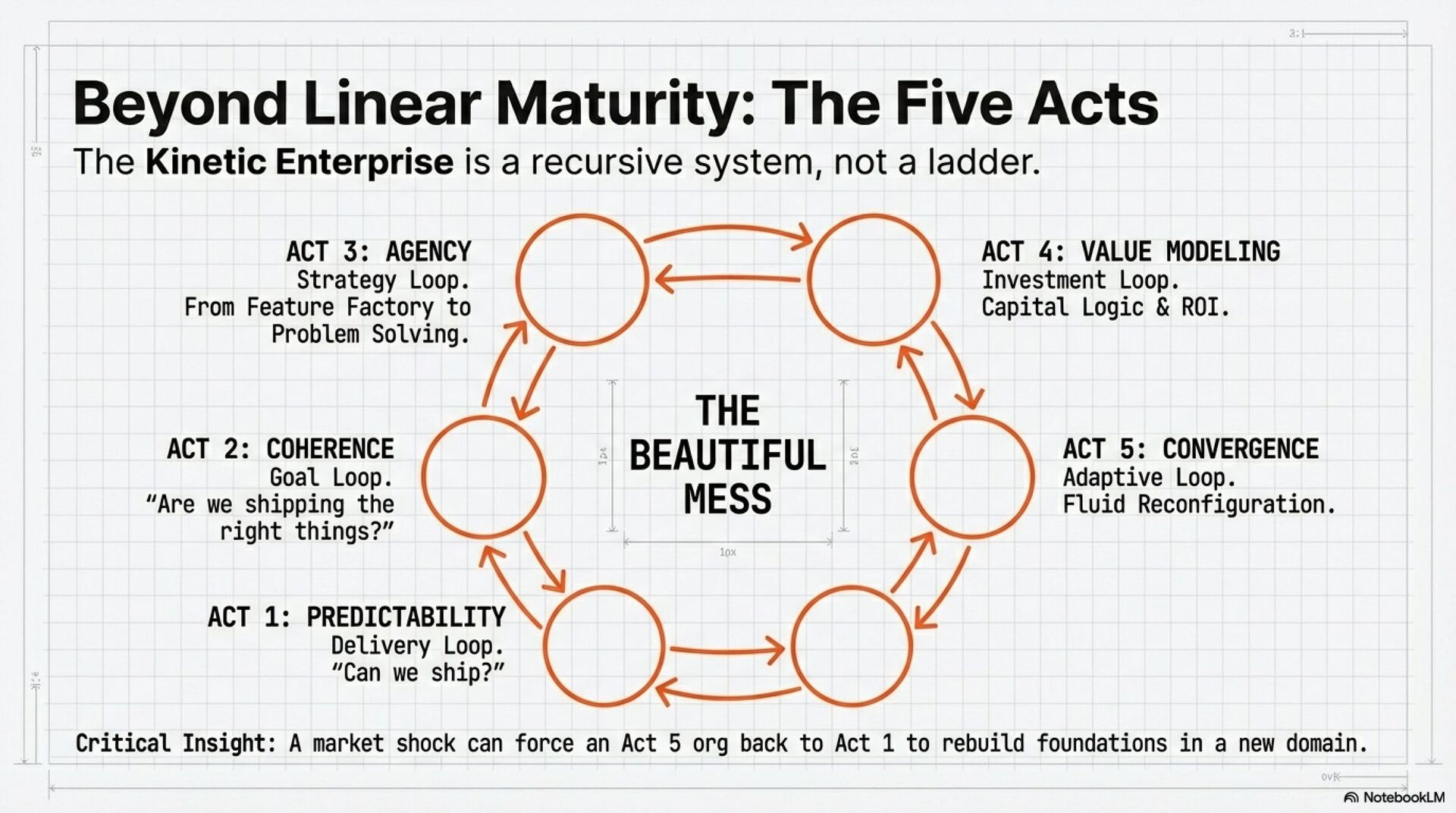 • The Kinetic Enterprise replaces a maturity ladder with five recursive acts: Predictability, Coherence, Agency, Value Modeling, Convergence, all coexisting as a “beautiful mess.” Page 8.