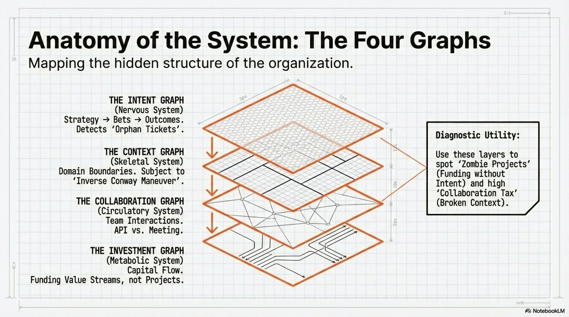 • Practical anatomy is expressed as four graphs that reveal the real system structure: Intent, Context, Collaboration, Investment, used diagnostically to spot “zombie projects” and broken context. Page 9.