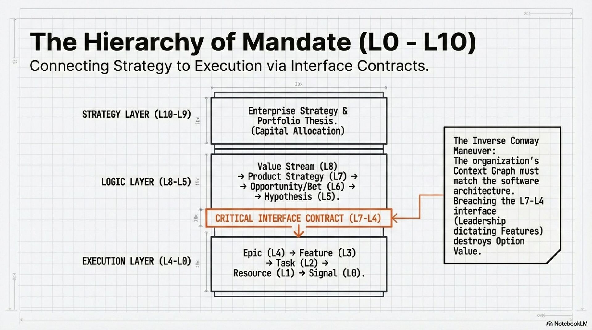 • The “Hierarchy of Mandate (L0–L10)” connects strategy and capital allocation to execution through a critical interface contract, with an explicit warning that mismatched context and architecture destroys option value (inverse Conway). Page 10.