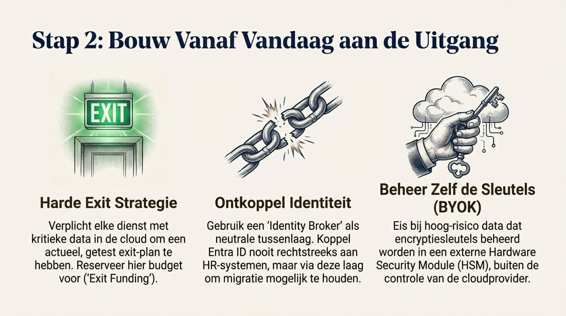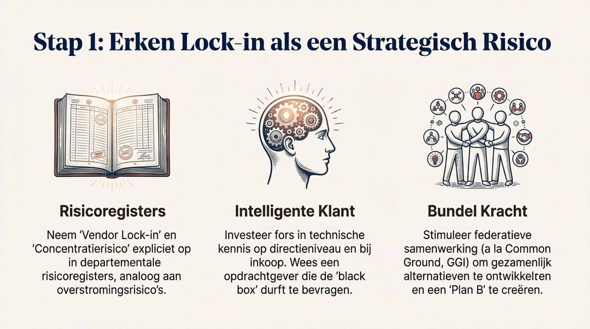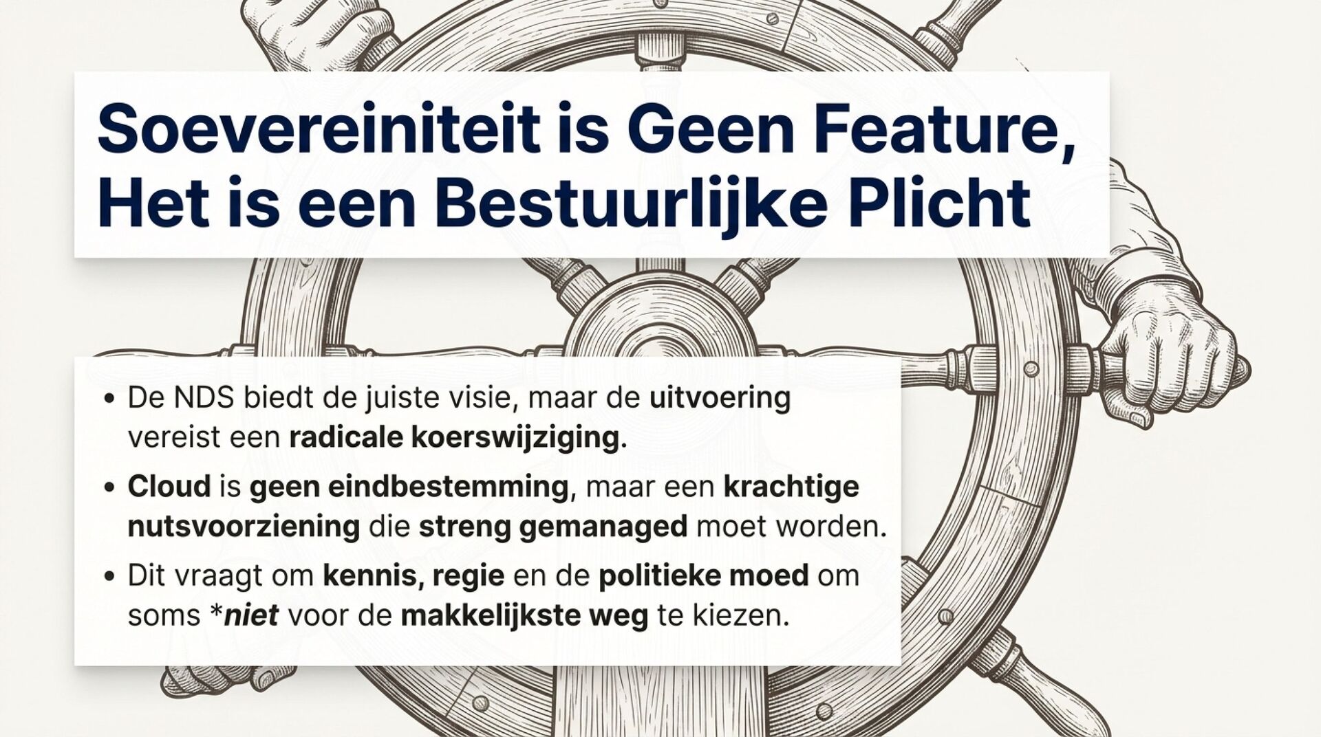 De strategische vraag voor bestuurders is daarom scherp: welke digitale kernfuncties wil je onder publieke regie houden, welke afhankelijkheden accepteer je expliciet, en waar eis je aantoonbare exitbaarheid, identity-ontkoppeling en sleutelbeheer buiten de provider?