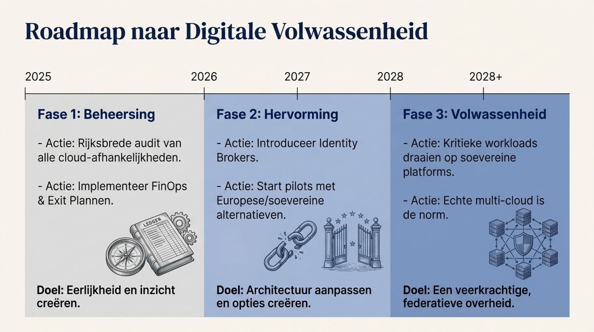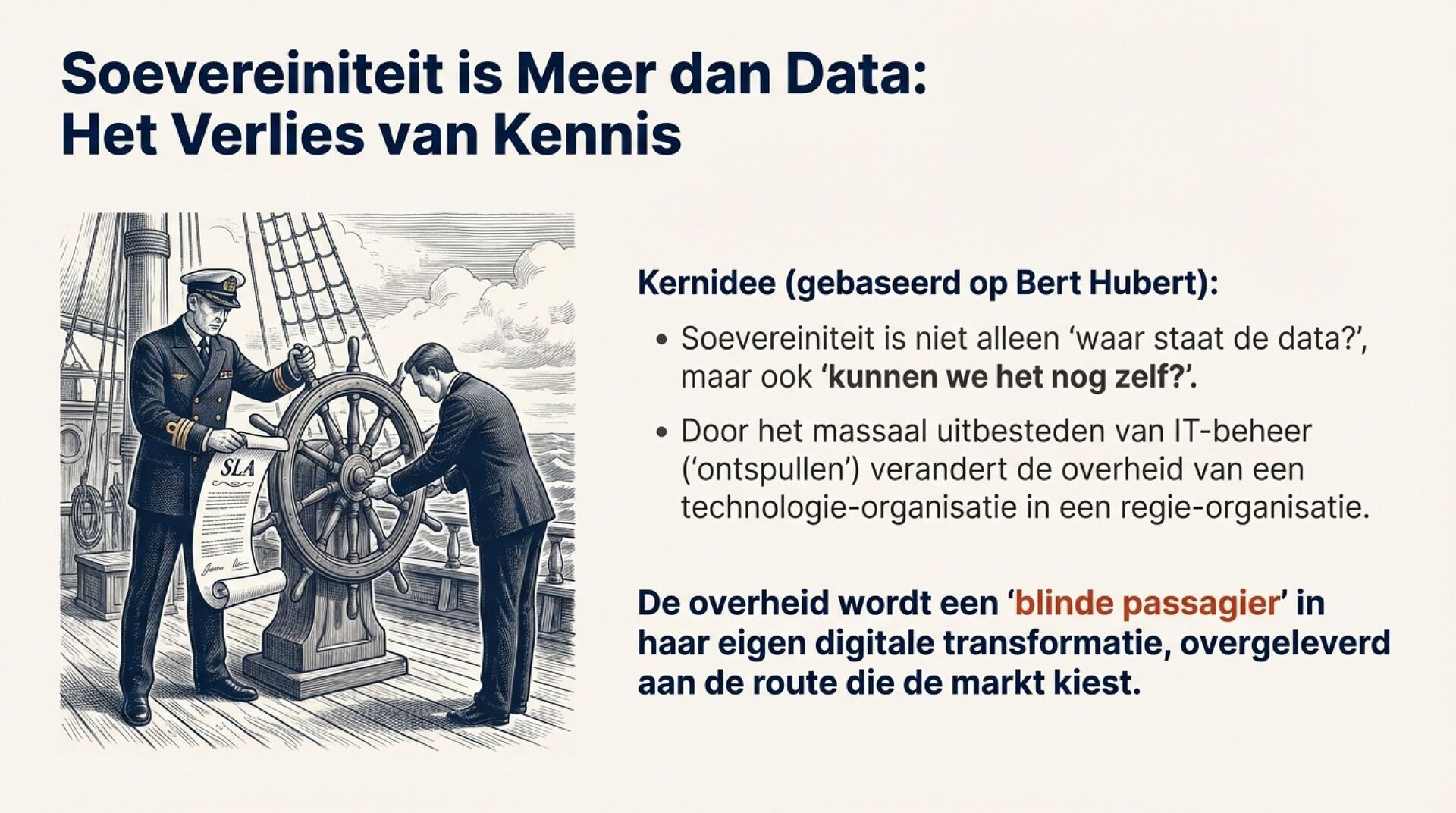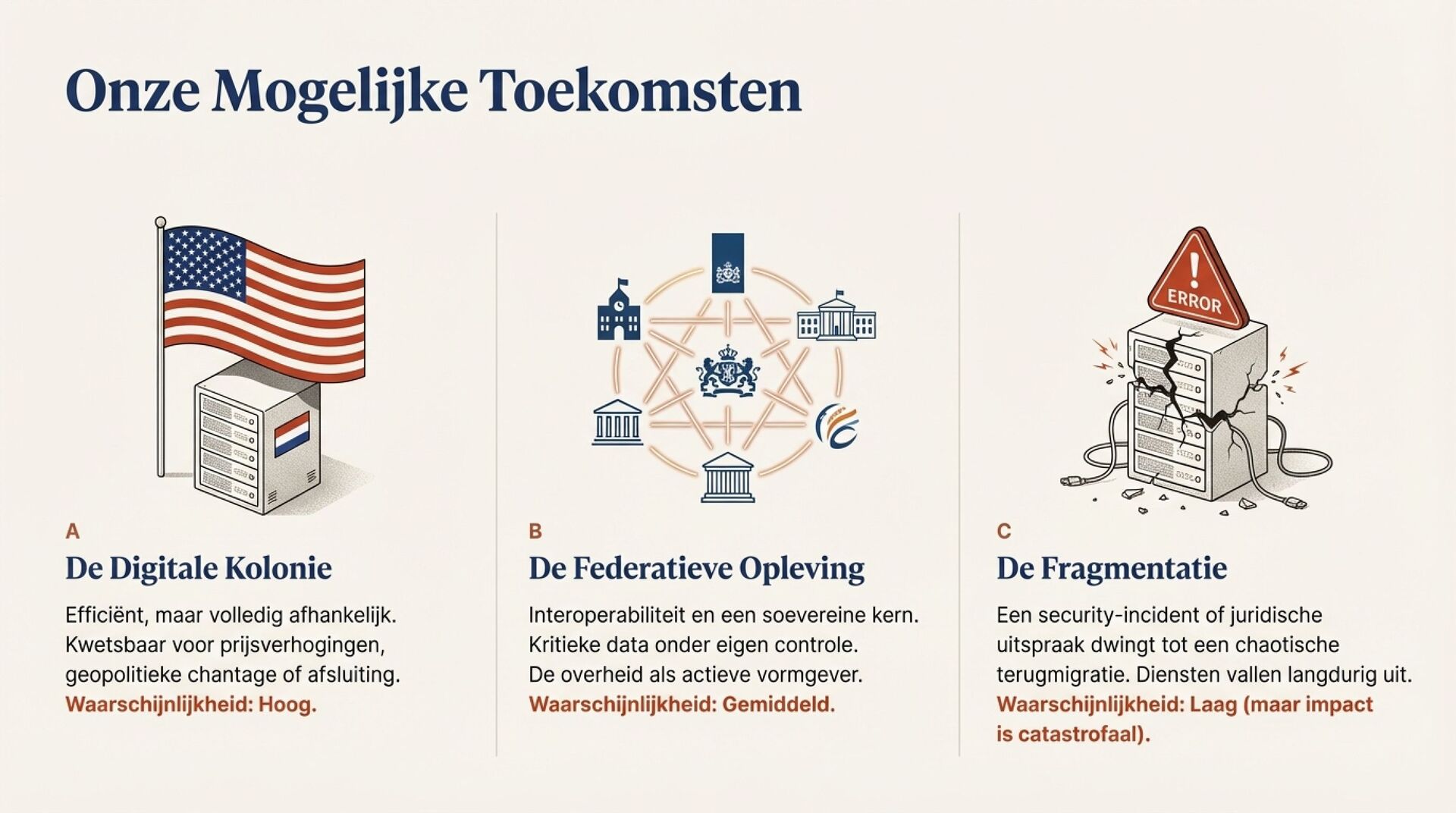 De strategische vraag voor bestuurders is daarom scherp: welke digitale kernfuncties wil je onder publieke regie houden, welke afhankelijkheden accepteer je expliciet, en waar eis je aantoonbare exitbaarheid, identity-ontkoppeling en sleutelbeheer buiten de provider?