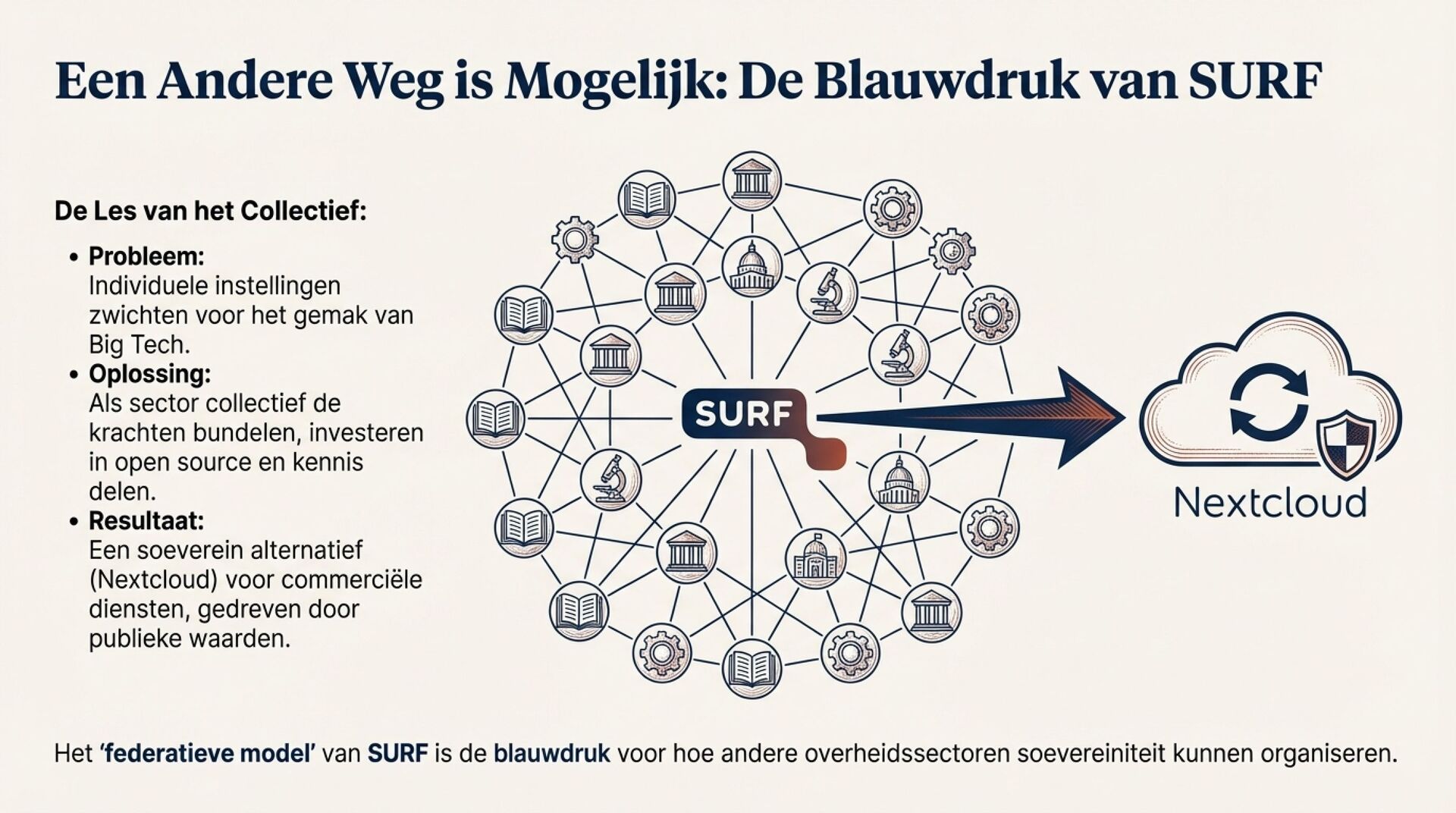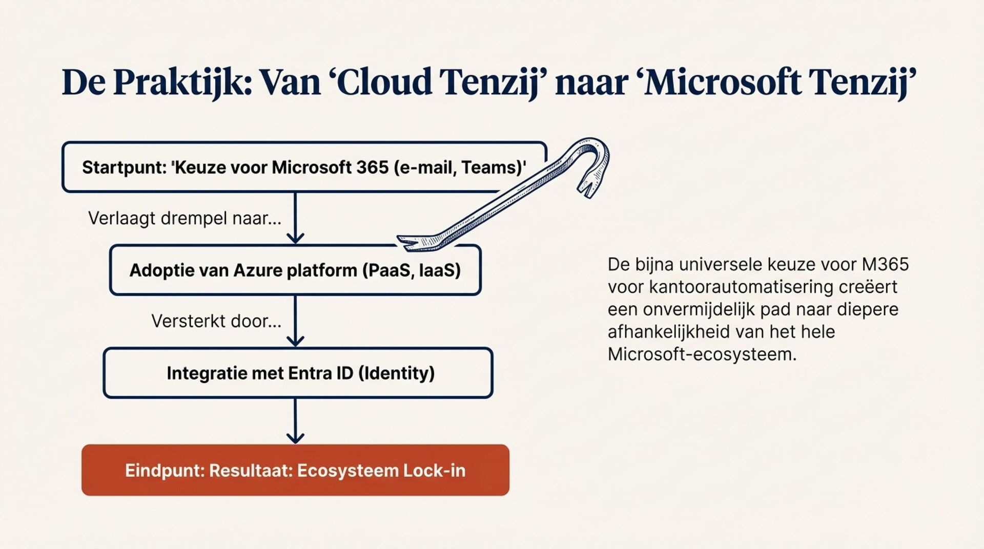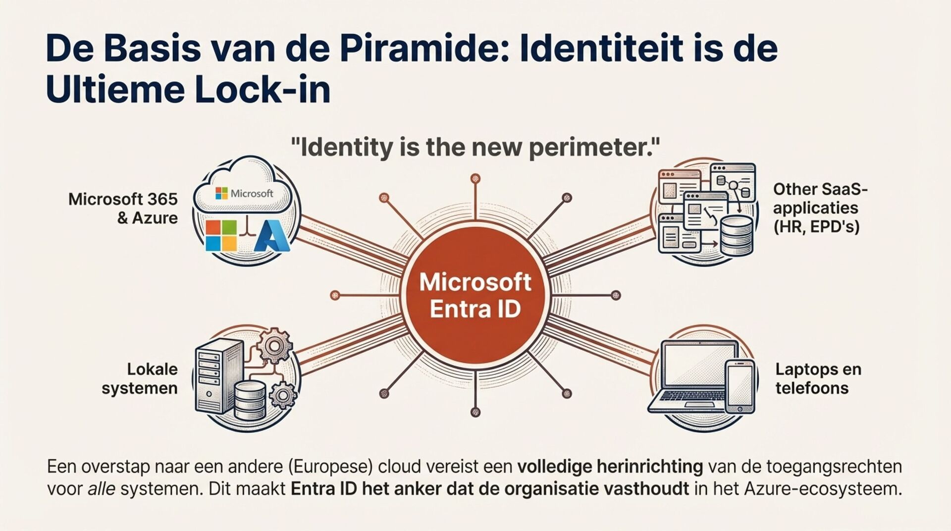 In de praktijk groeit een “Microsoft-tenzij” patroon. M365 fungeert als breekijzer, vervolgens trekt identity (Entra ID) de rest van het ecosysteem mee. Dit verklaart waarom uitvoeringsorganisaties, zoals de Belastingdienst, doorgaan met M365 ondanks politieke en soevereiniteitszorgen, omdat functionele alternatieven niet gelijkwaardig worden geacht.