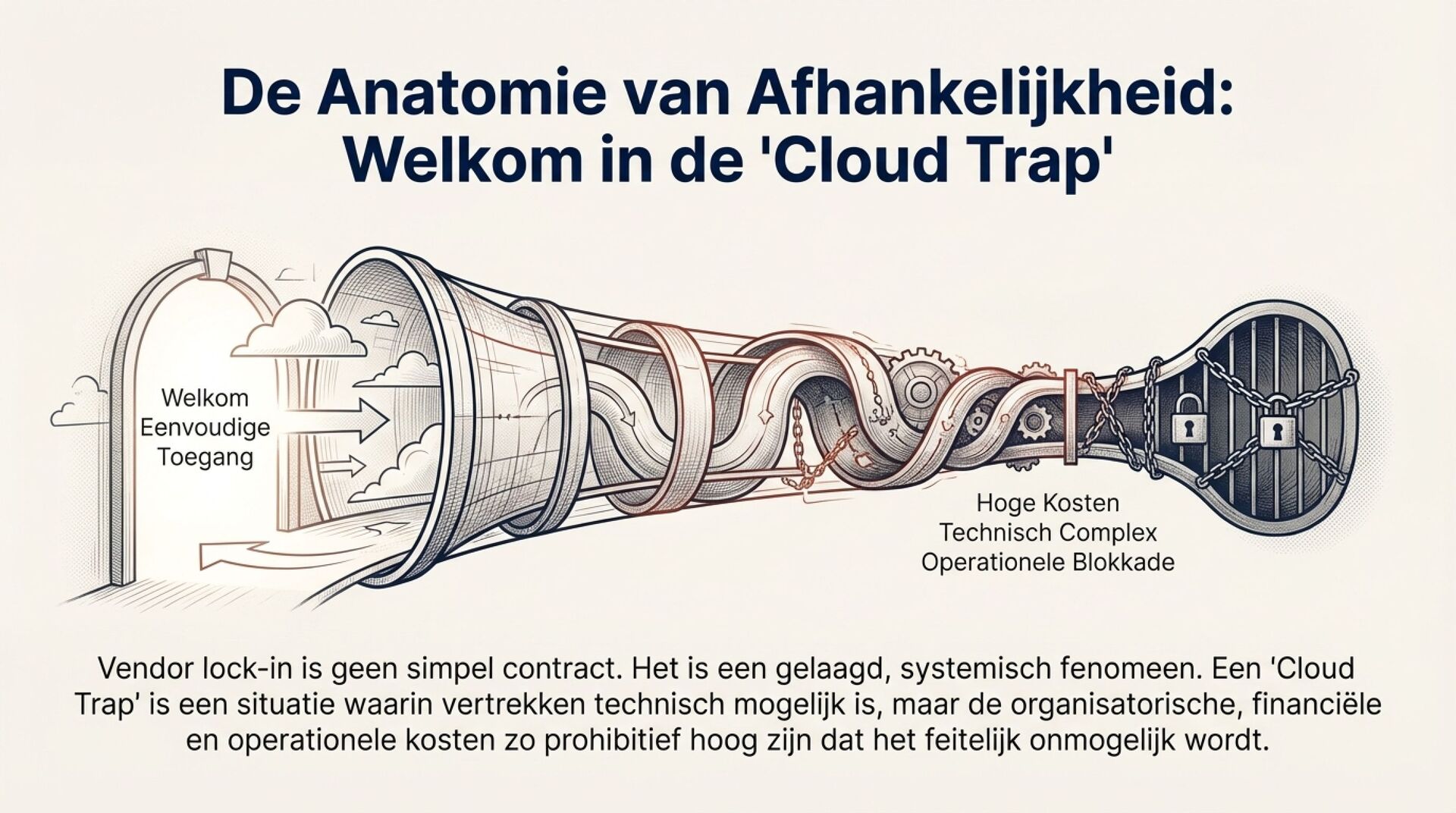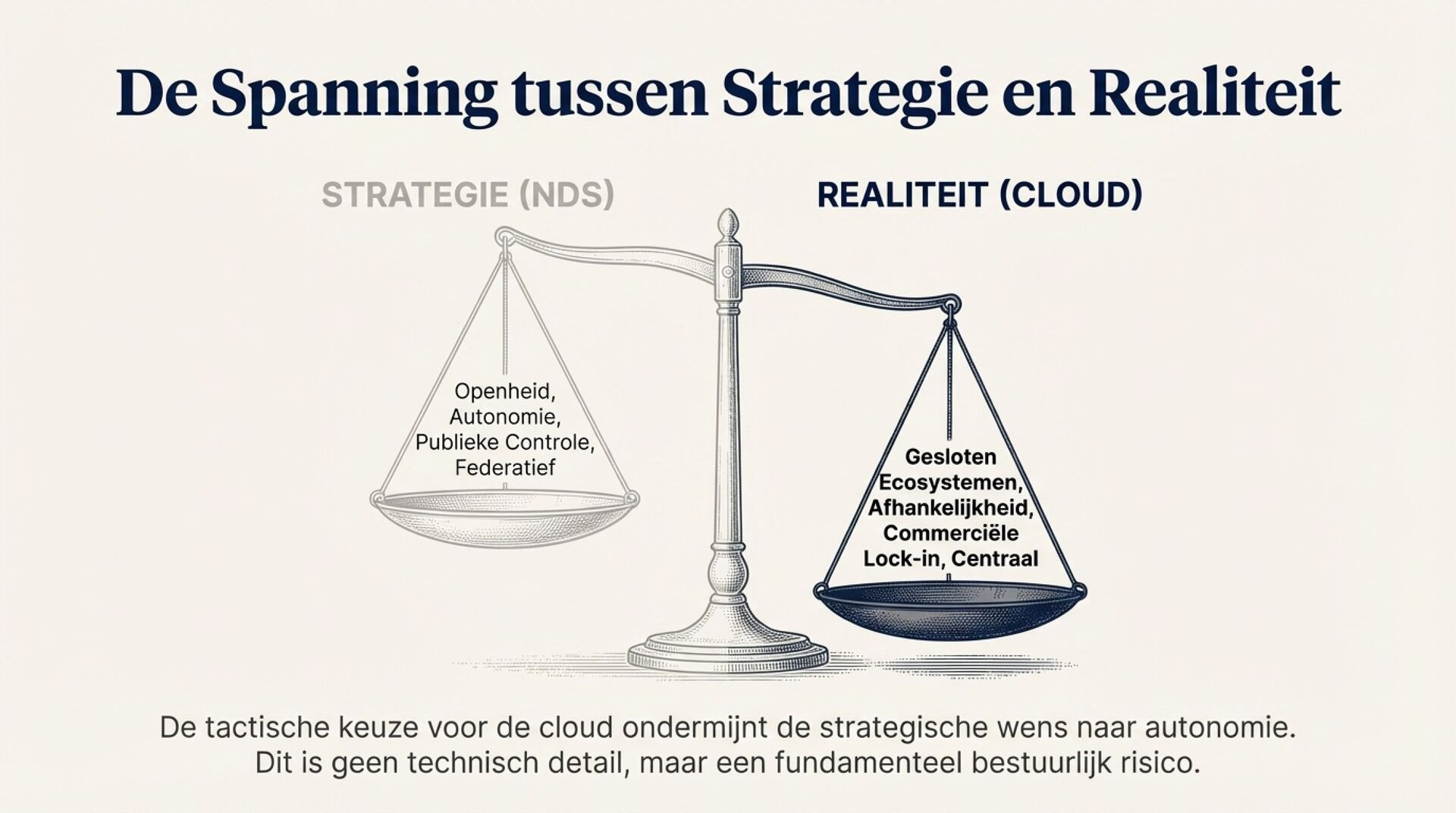 De Nederlandse Digitalisering Strategie (NDS) stuurt op digitale soevereiniteit, publieke controle, open standaarden en federatieve samenwerking. Tegelijkertijd versnelt de publieke sector haar adoptie van public cloud, vaak richting een klein aantal dominante, niet-Europese platforms. Daardoor ontstaat een bestuurlijke spanning: je moderniseert sneller, maar je bouwt ook systemische afhankelijkheden op die lastig terug te draaien zijn.