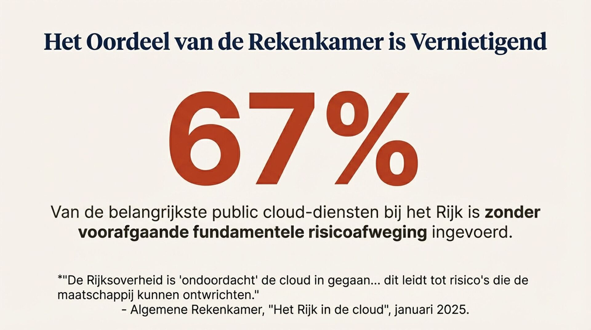 De Algemene Rekenkamer zette in januari 2025 een harde reality check neer. Het Rijk heeft beperkt zicht op clouddiensten, bij ongeveer twee derde van de belangrijkste clouddiensten ontbreken verplichte risicoafwegingen, en van ruim een kwart is zelfs het type cloud niet bekend. Dit maakt continuïteit, soevereiniteit en exit-strategie een governanceprobleem, geen technisch detail.