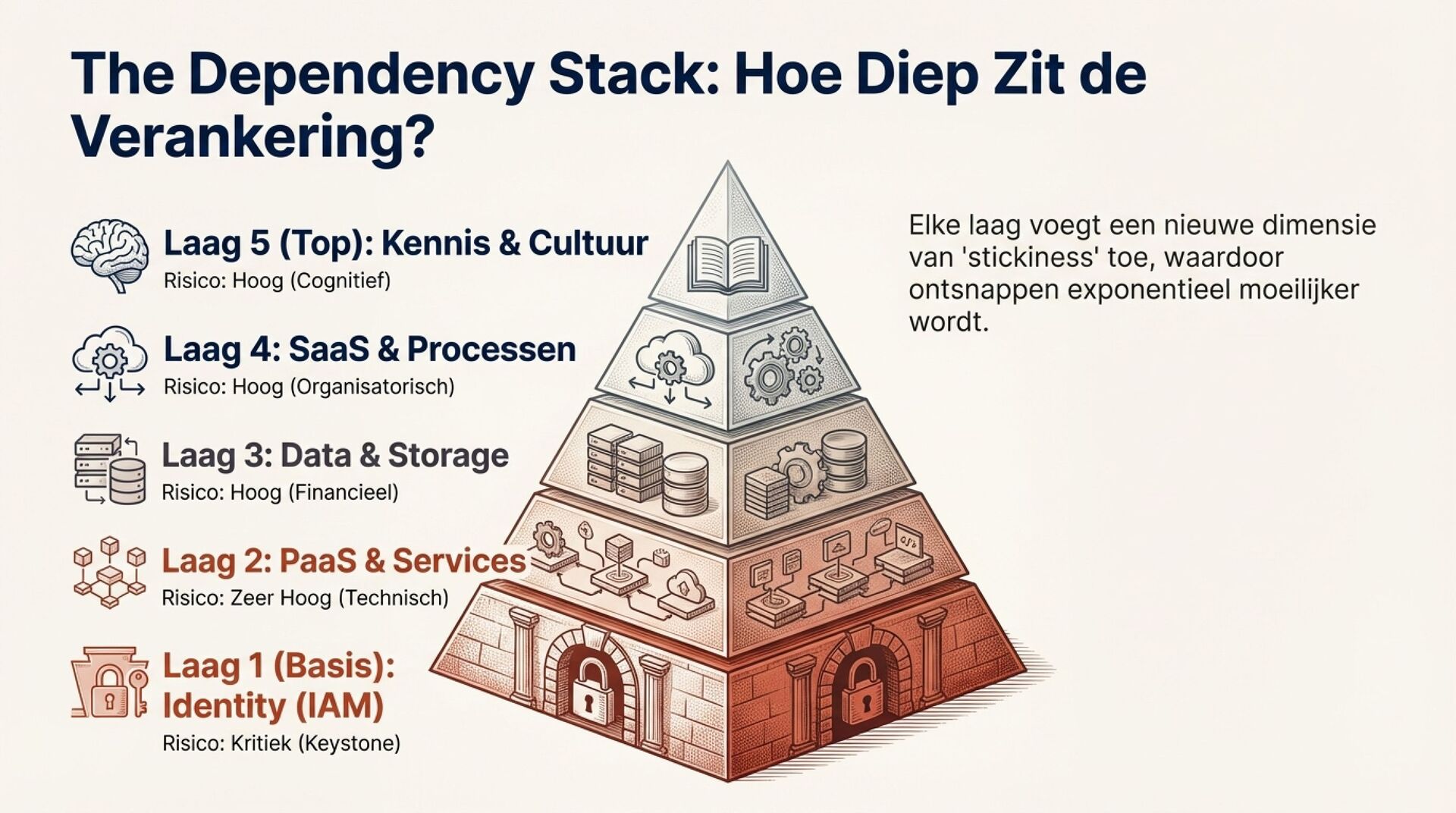 De kern van de afhankelijkheid zit niet alleen in contracten, maar in een dependency stack. Identity is de keystone, daarna volgen PaaS, data gravity, SaaS-proces-lock-in, en kennis- en cultuur-lock-in. Als je identity, processen en data eenmaal verweven zijn met één platform, wordt “exit” organisatorisch en financieel bijna onhaalbaar. Bovendien vergroot concentratie het systeemrisico: één verstoring raakt niet één organisatie, maar een groot deel van de overheid.