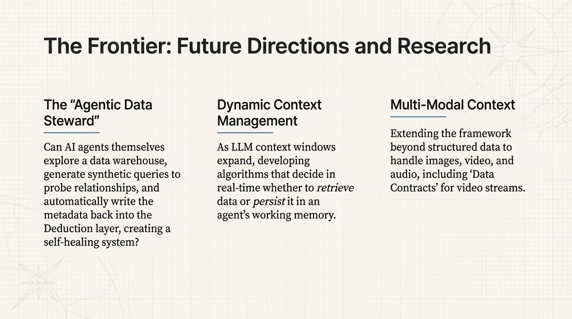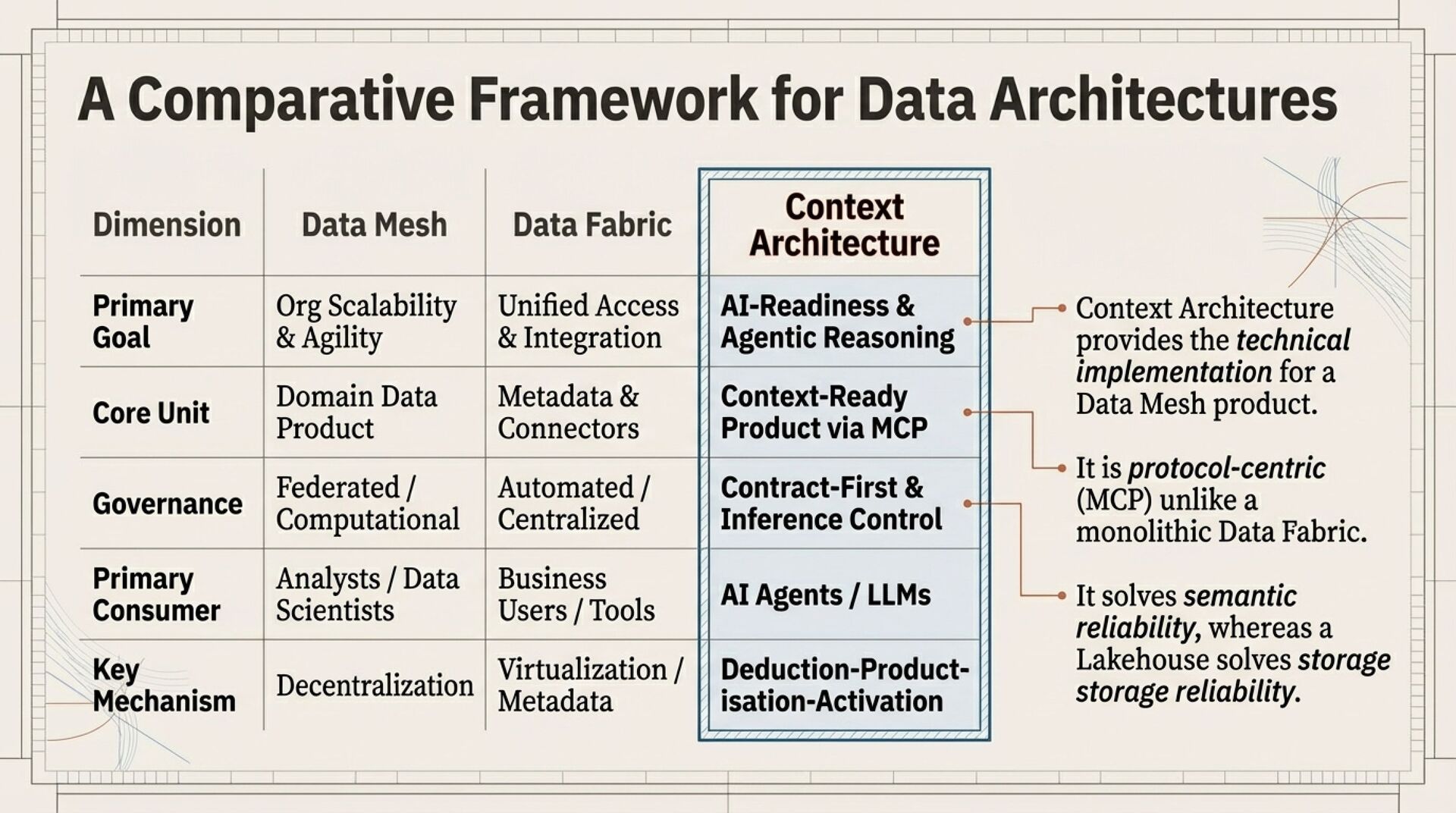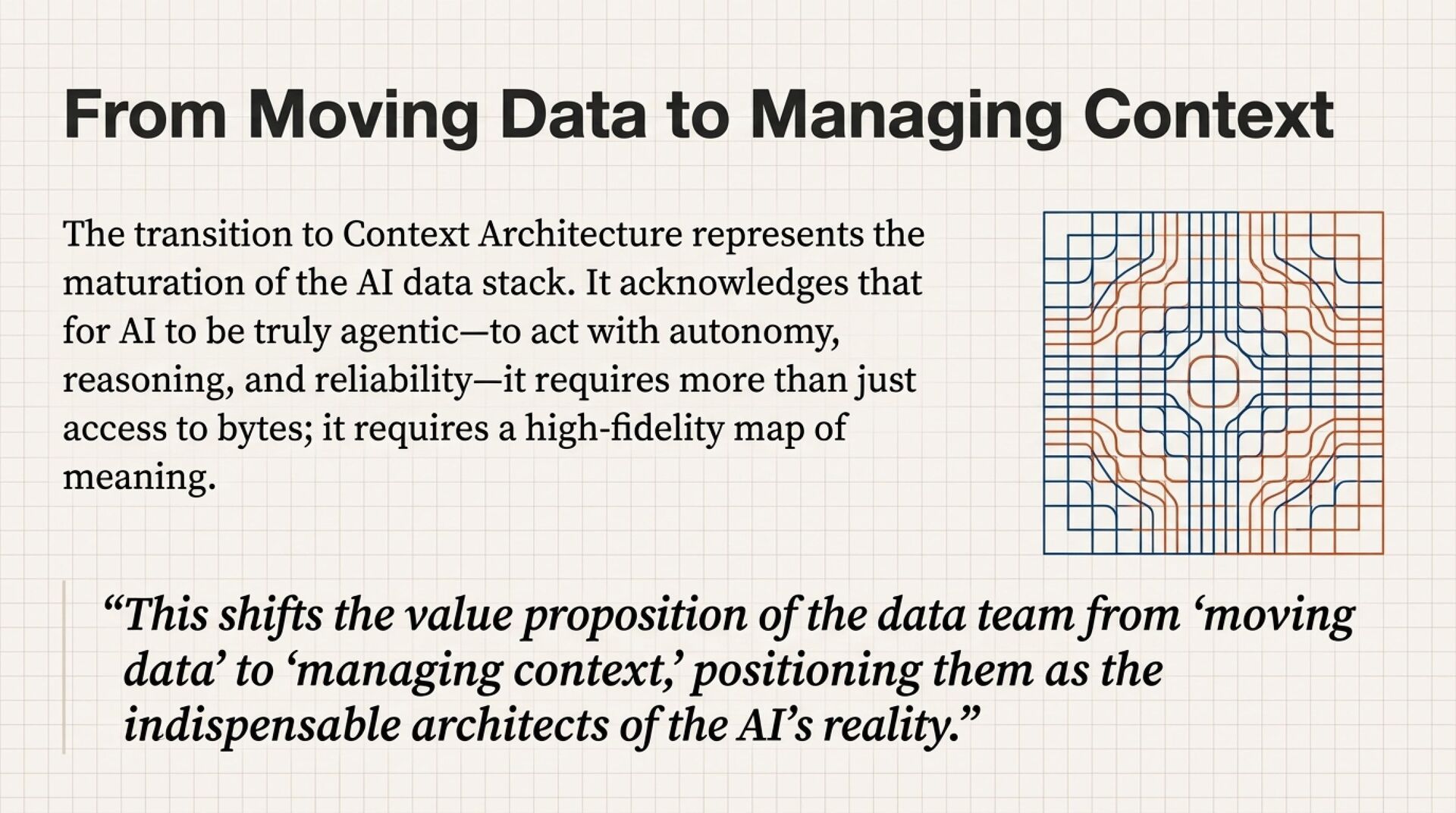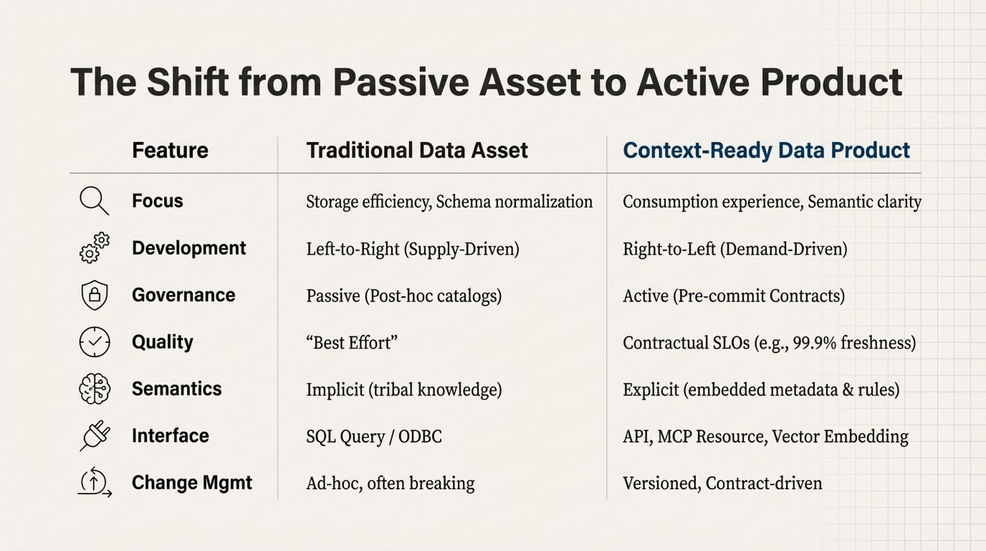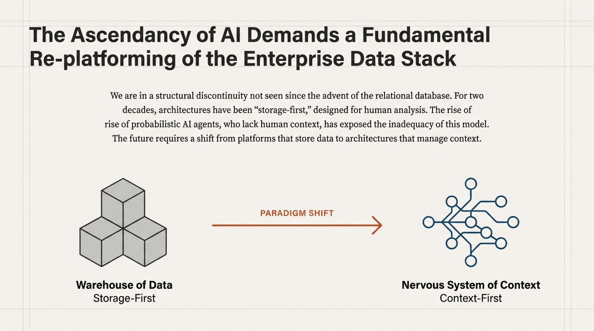 The result is a re-platforming thesis. To operate in the agentic era, your data platform must stop behaving like a passive repository and start behaving like a context manager that can prove meaning, enforce policy, and deliver admissible inputs to AI systems.