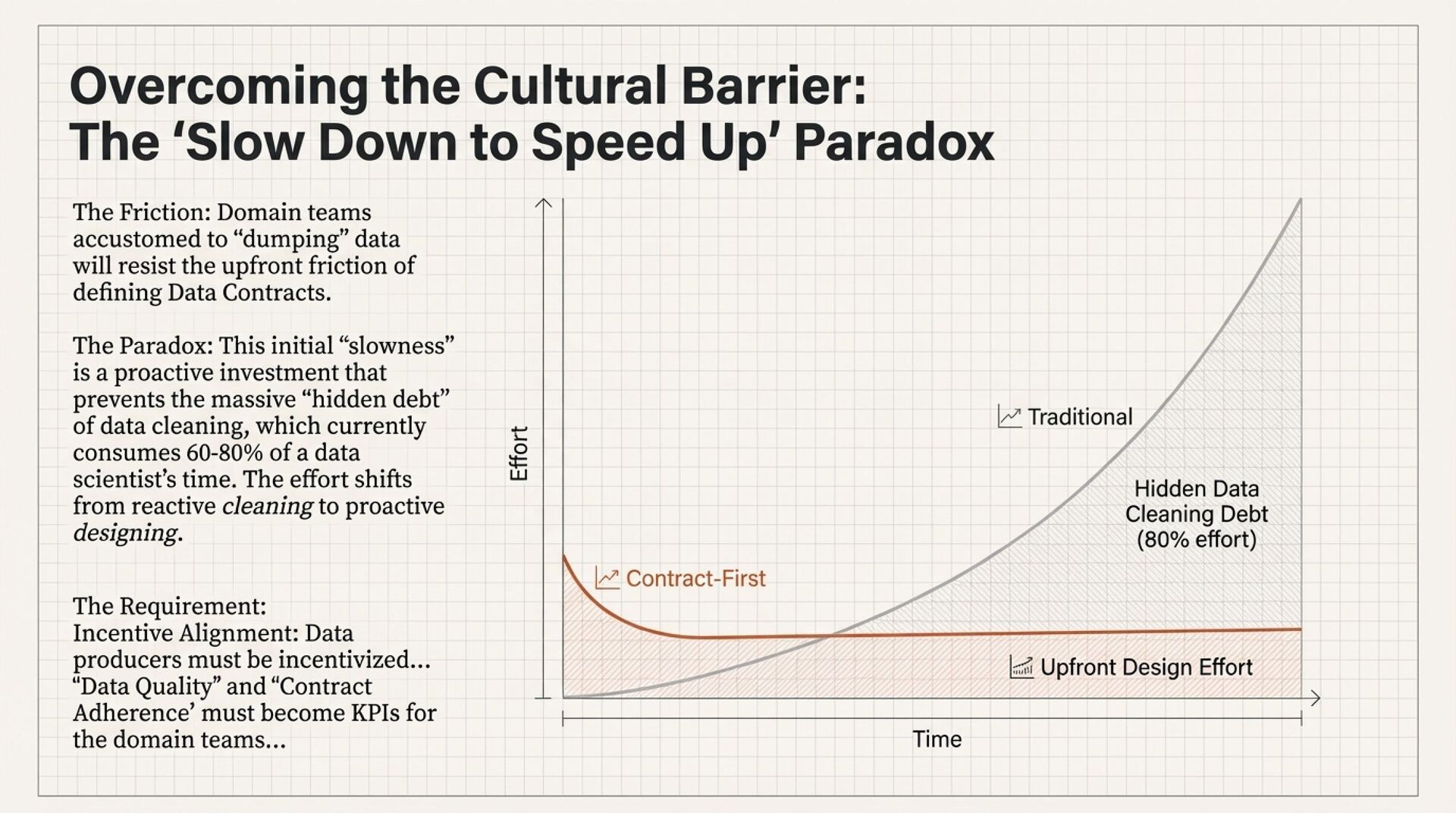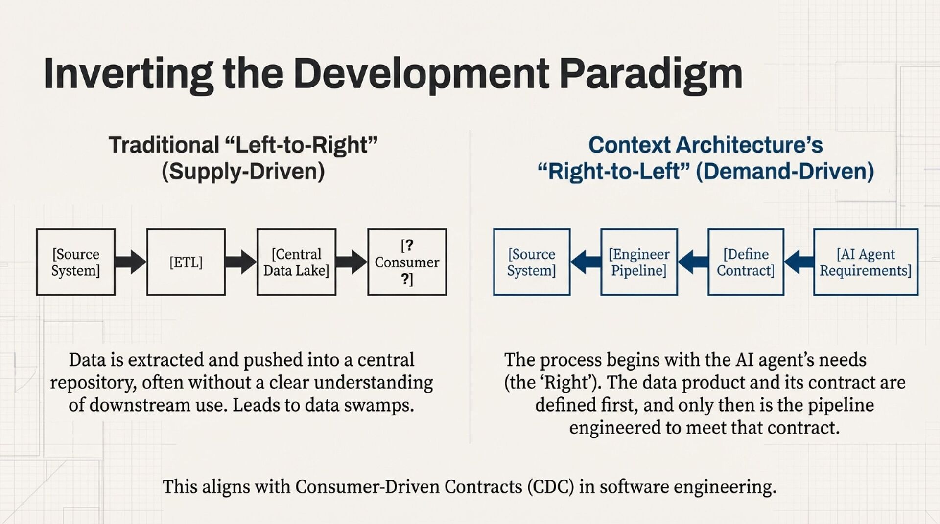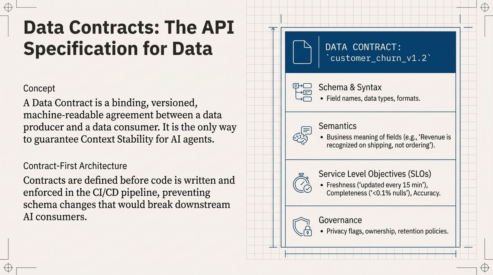 Productisation hardens context into reliable “data products.” It flips data engineering from left-to-right pipelines to right-to-left, consumer-driven design. You define the AI consumer’s needs first, then build backwards using contract-first data contracts with versioning, semantics, SLOs for freshness and quality, and CI/CD enforcement to prevent schema drift. Consequently, domain ownership becomes non-negotiable because only domains can supply durable meaning.