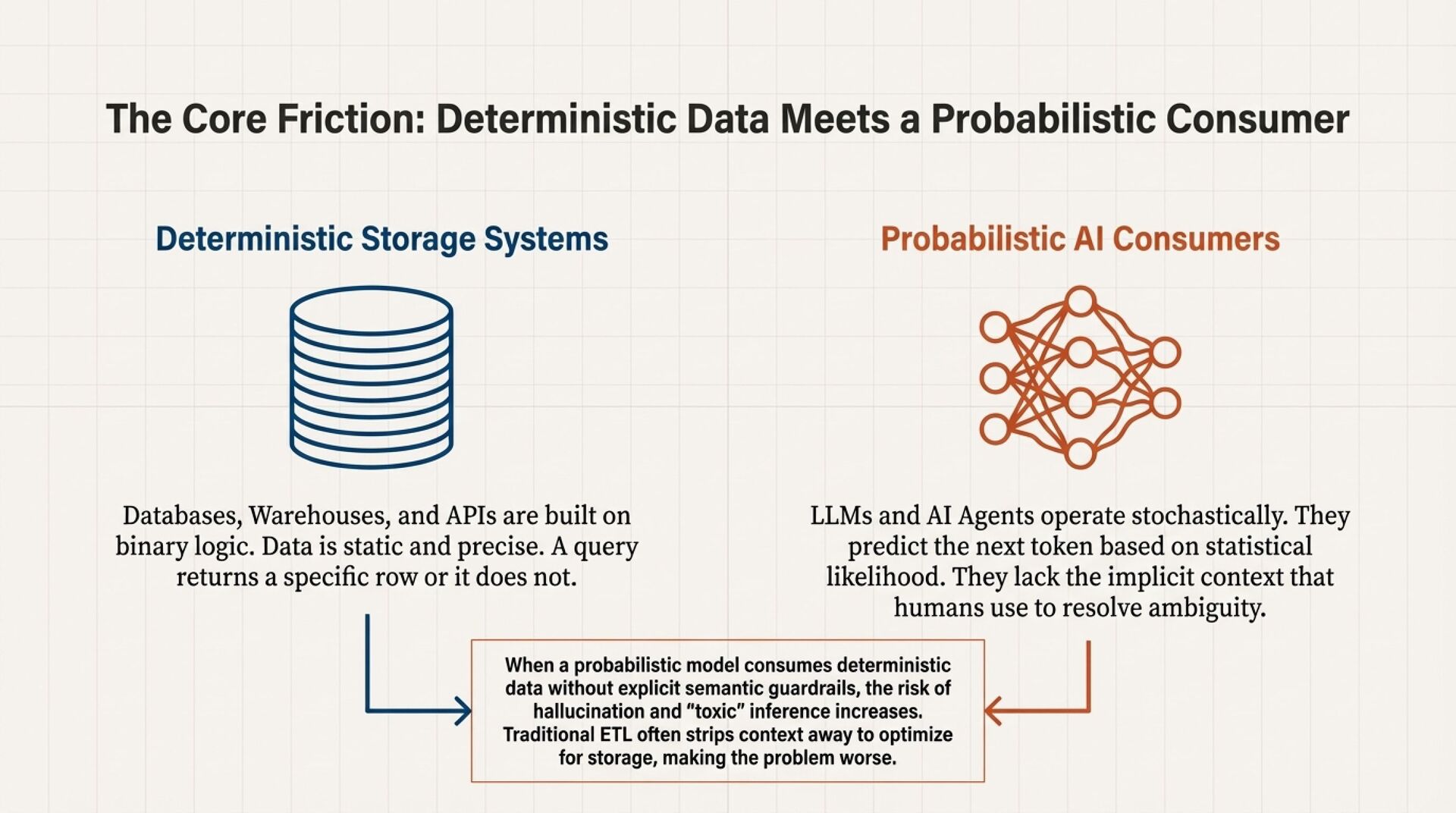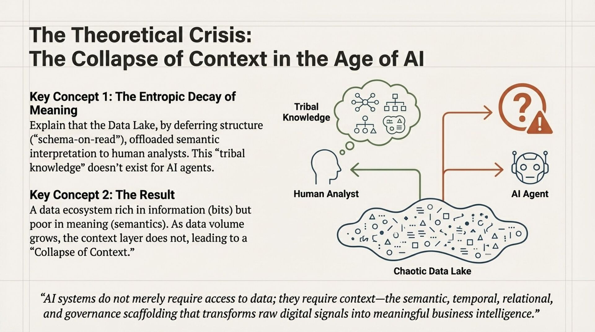 Enterprise data platforms are hitting a breaking point. Your EDW, data lake, and lakehouse were built to store and process data for humans, dashboards, analysts, and known questions. However, LLMs and autonomous agents do not just need data, they need context. Without semantic, temporal, relational, and governance context, AI systems drift into hallucination, ambiguity, and unsafe inference.