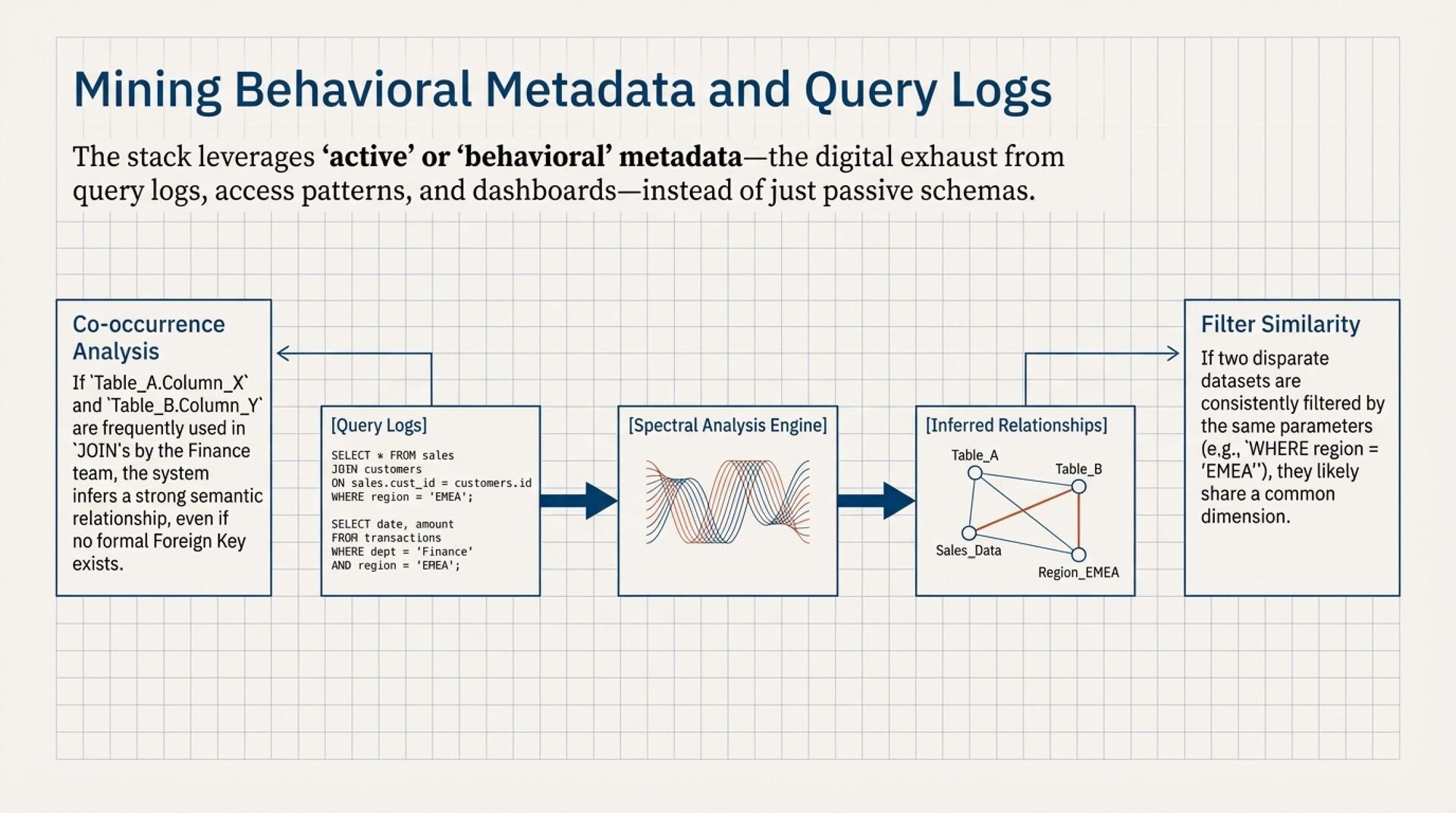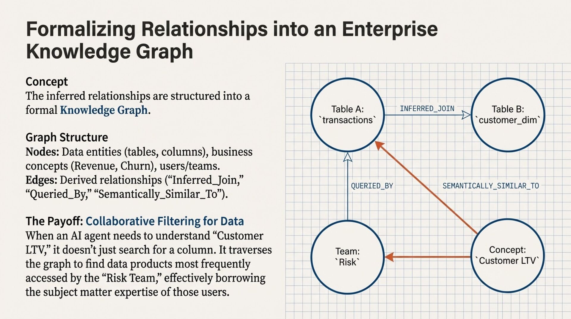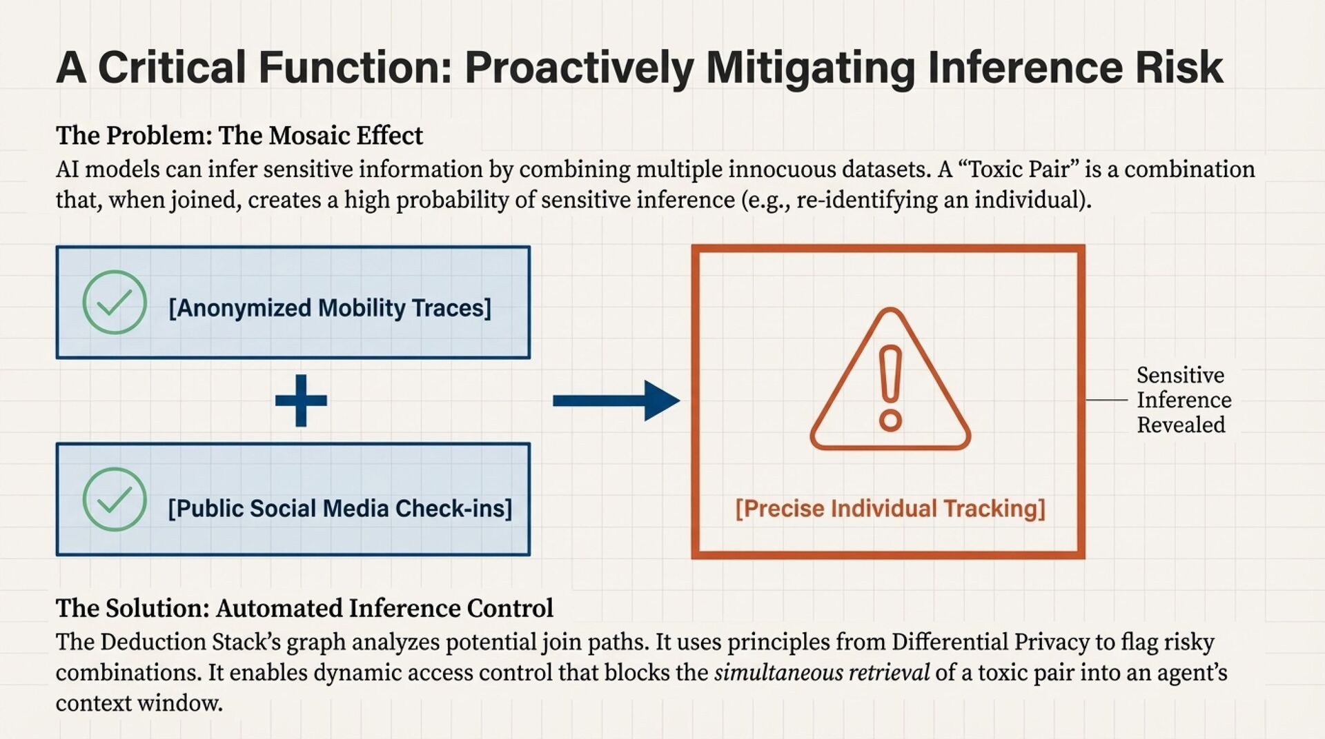 Deduction turns “usage into meaning.” It mines query logs, joins, filters, and behavioral metadata to infer real semantic relationships and build a living “usage graph” that can become an enterprise knowledge graph. Additionally, it becomes a privacy engine by detecting “toxic pairs,” combinations of otherwise safe datasets that enable sensitive inference, and blocking those combinations before they ever reach an AI context window.