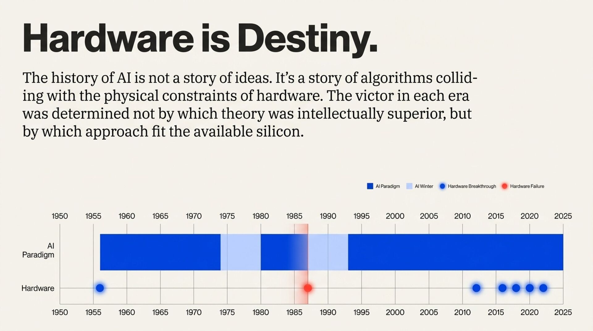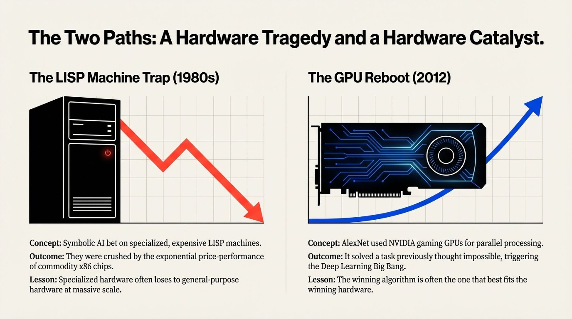 • Symbolic AI did not only fail on theory, it failed on scalability and economics. Expert systems hit the knowledge acquisition bottleneck, and LISP machines lost to commodity x86 price performance. The modern implication is clear, specialized hardware often loses when general-purpose compute reaches massive scale.