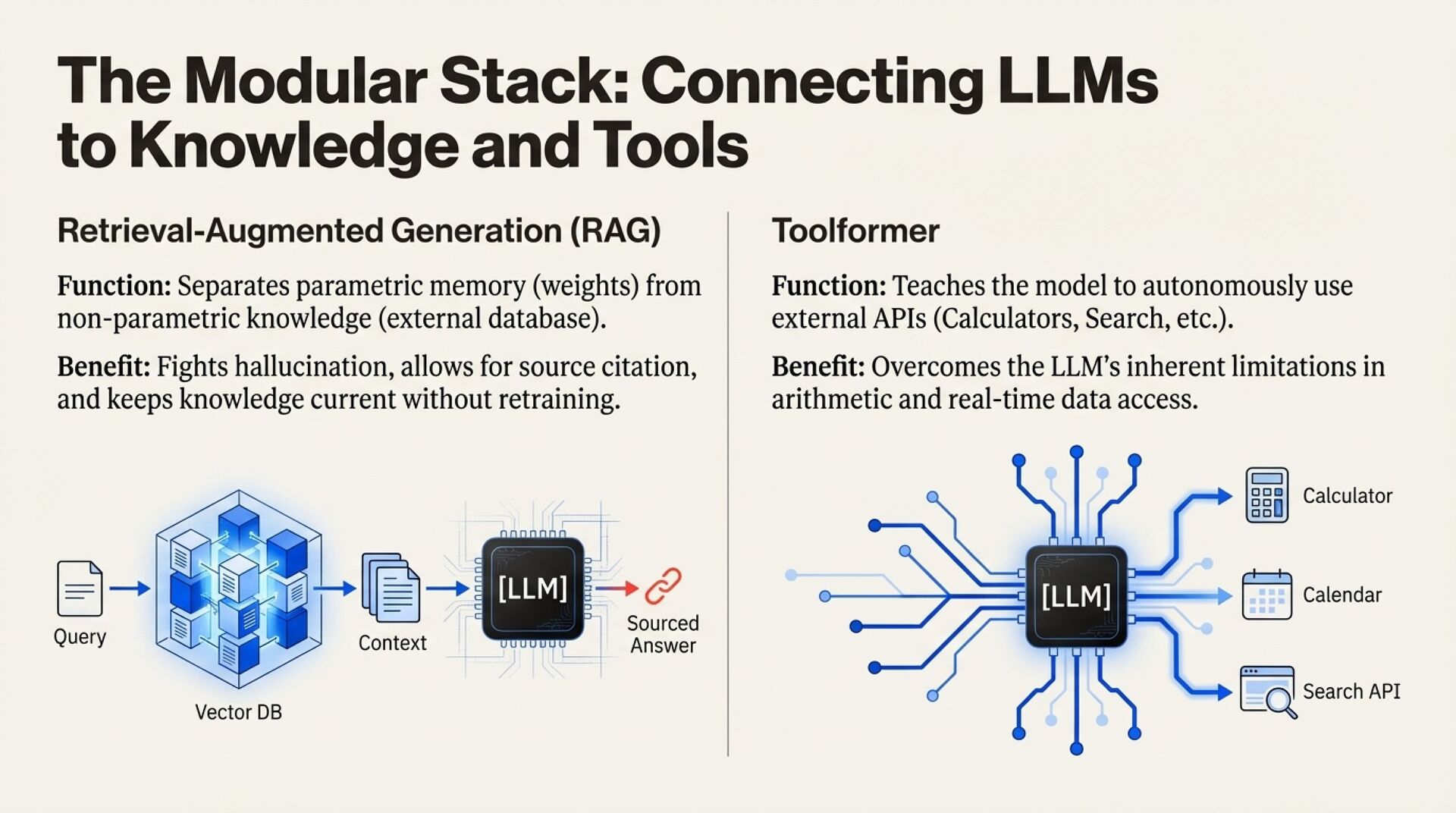 • Toolformer formalizes the agentic interface, models learn when to call APIs.