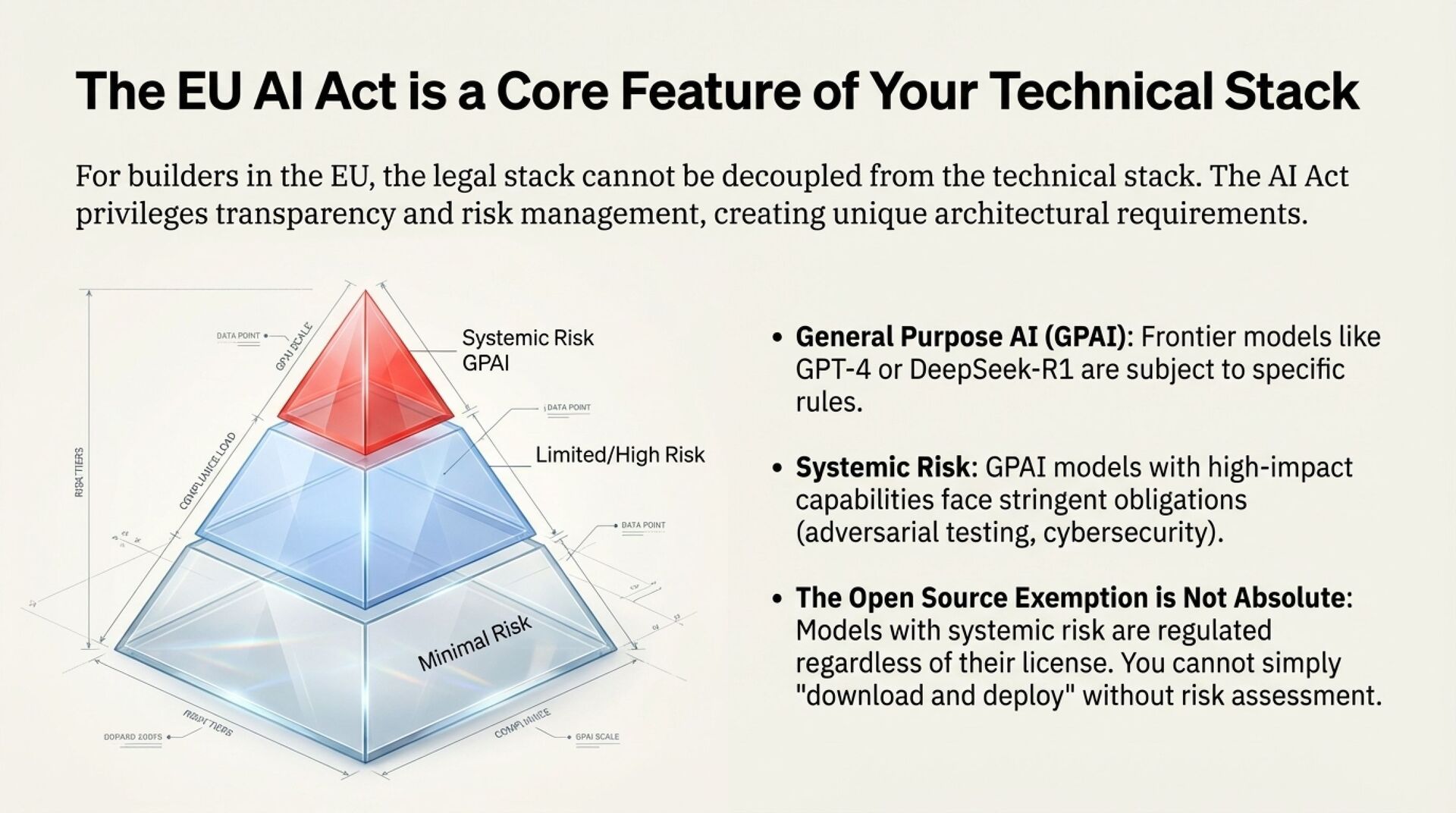 • The EU AI Act makes compliance a design constraint, not a legal afterthought, especially for GPAI and systemic-risk obligations.