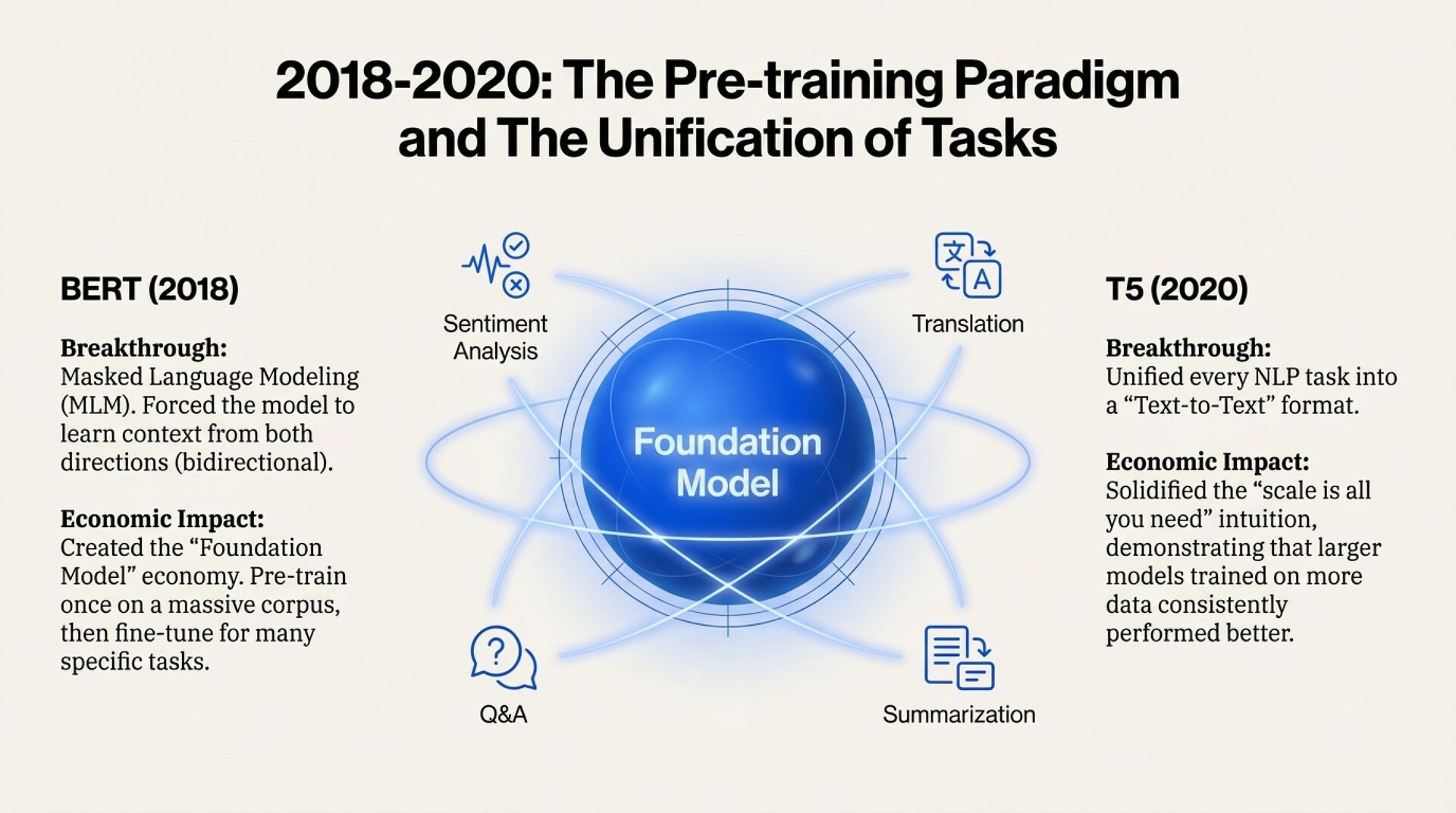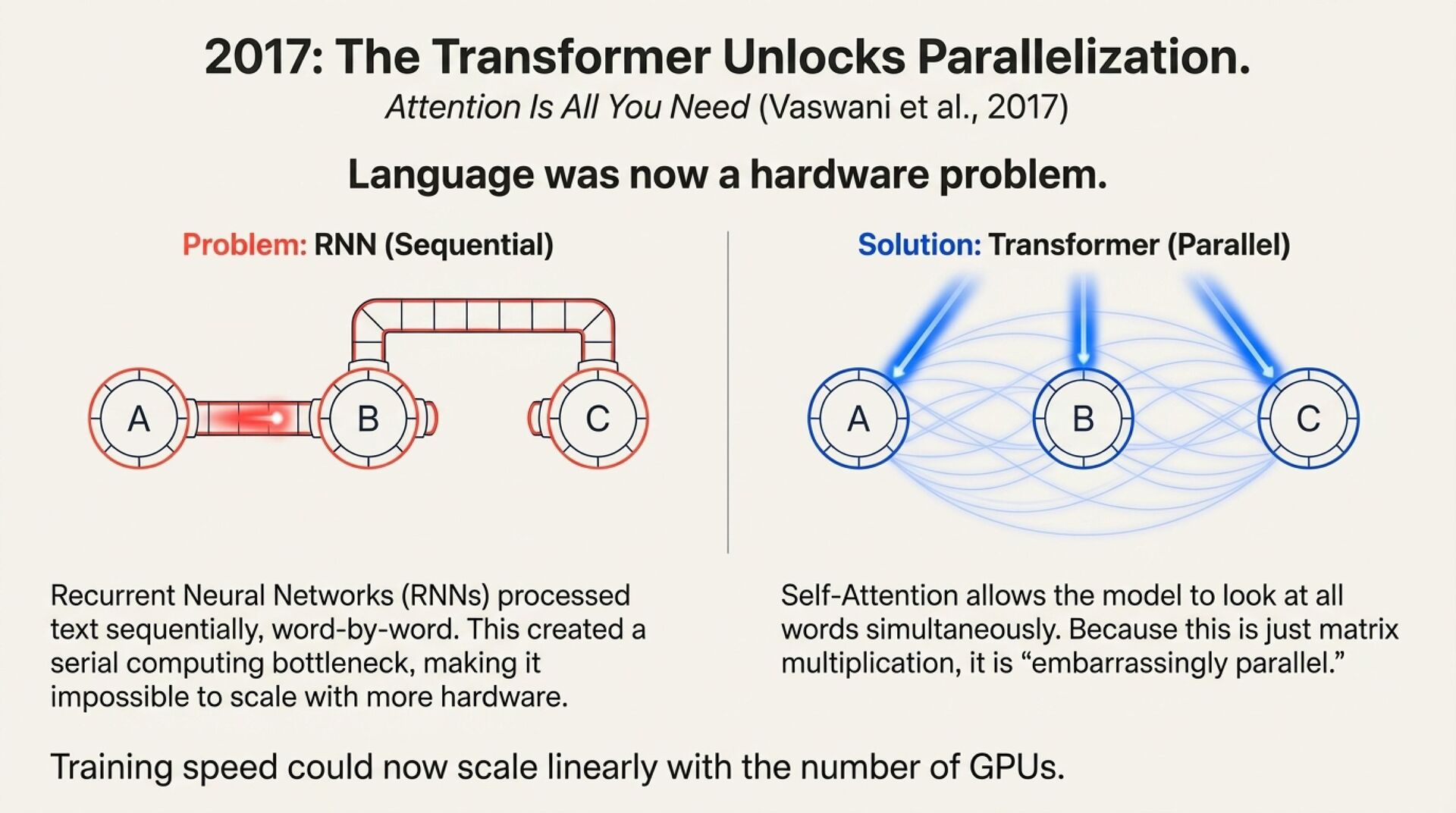 • Transformers (2017) became dominant because self-attention reduces language modeling to highly parallel matrix operations, perfectly aligned with GPU architectures and memory bandwidth.