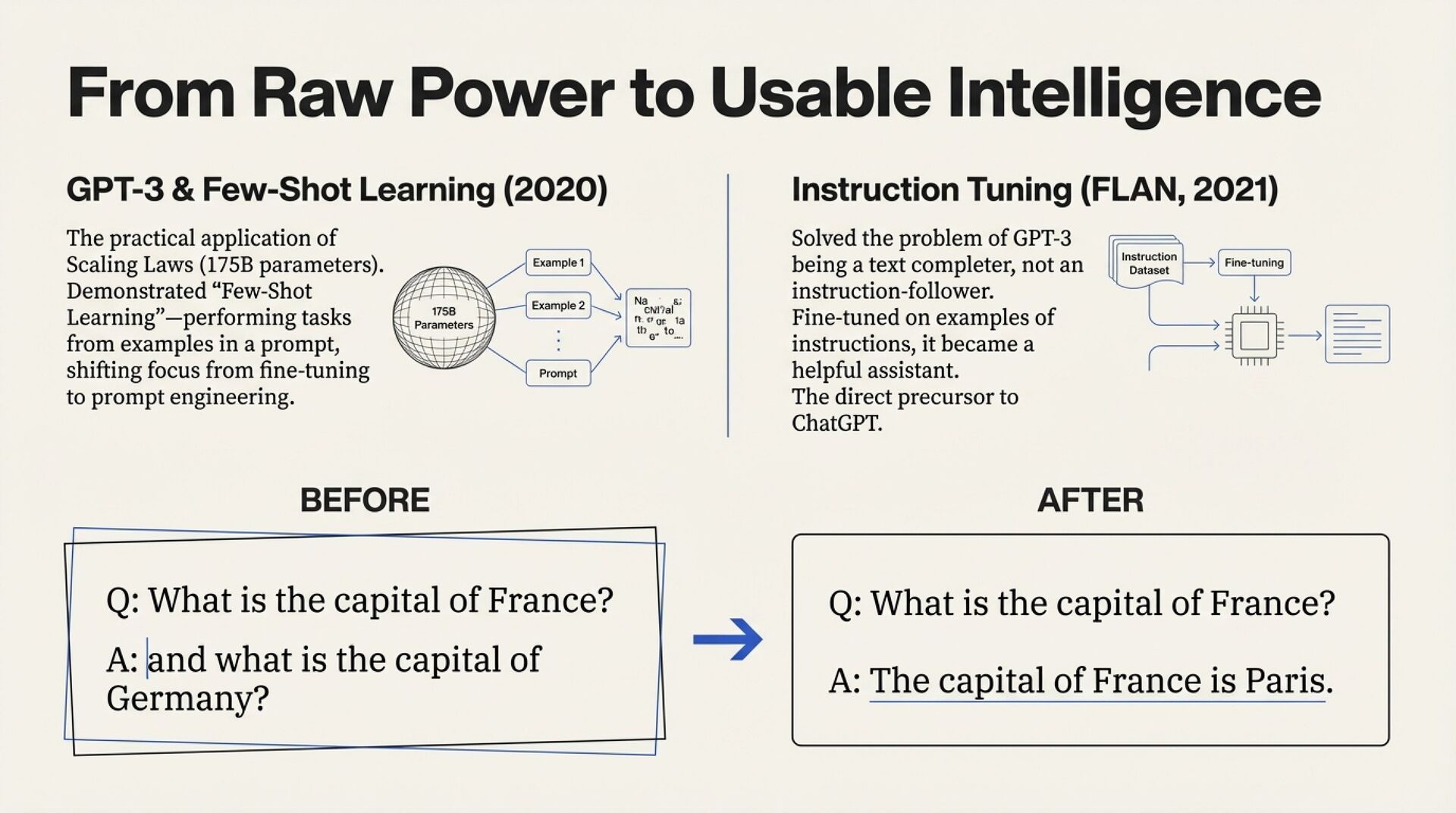 • Instruction tuning, models become usable assistants by learning intent, not pattern completion.