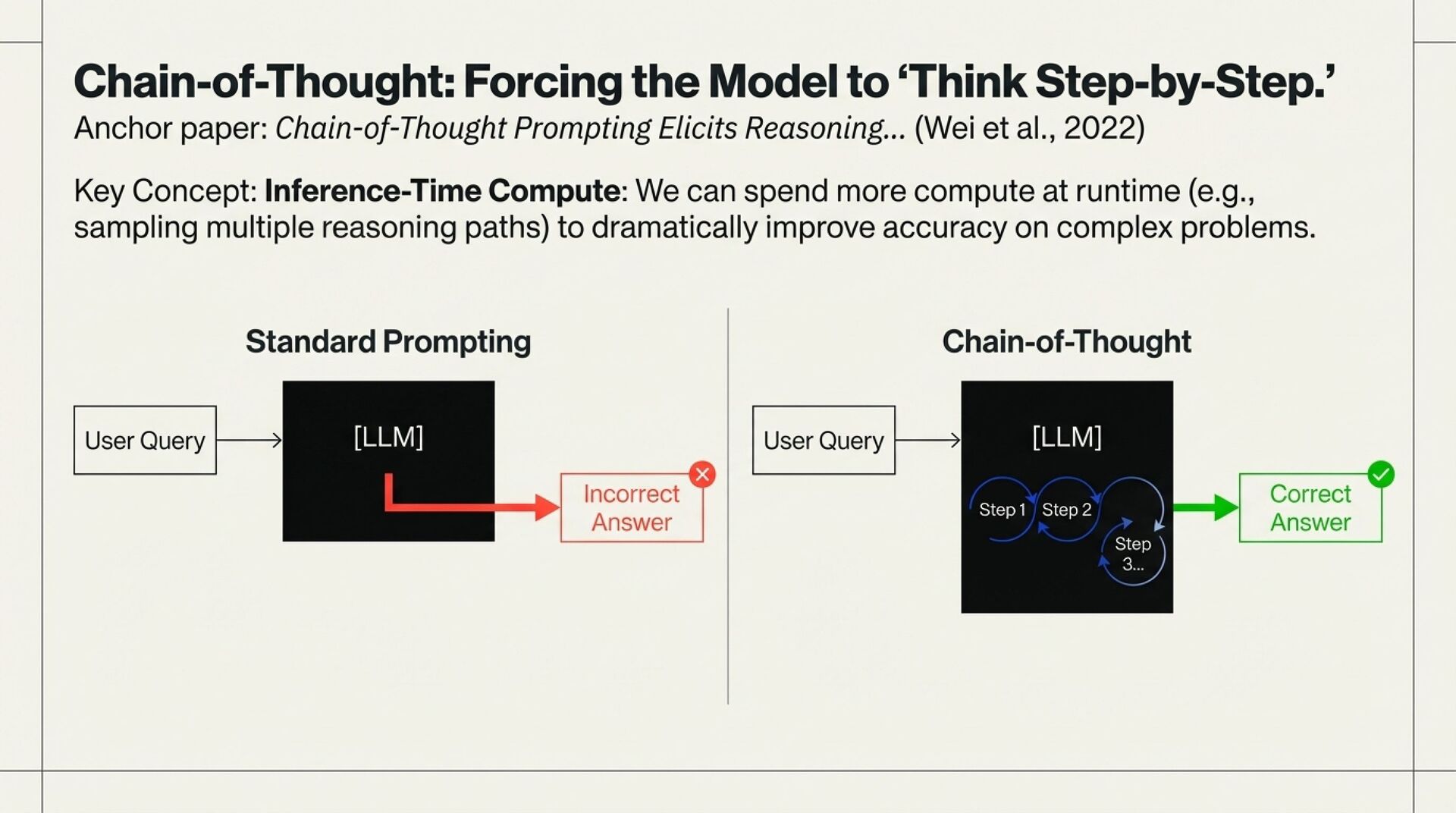 • Chain-of-thought and self-consistency introduce inference-time compute as a design lever, accuracy costs tokens.