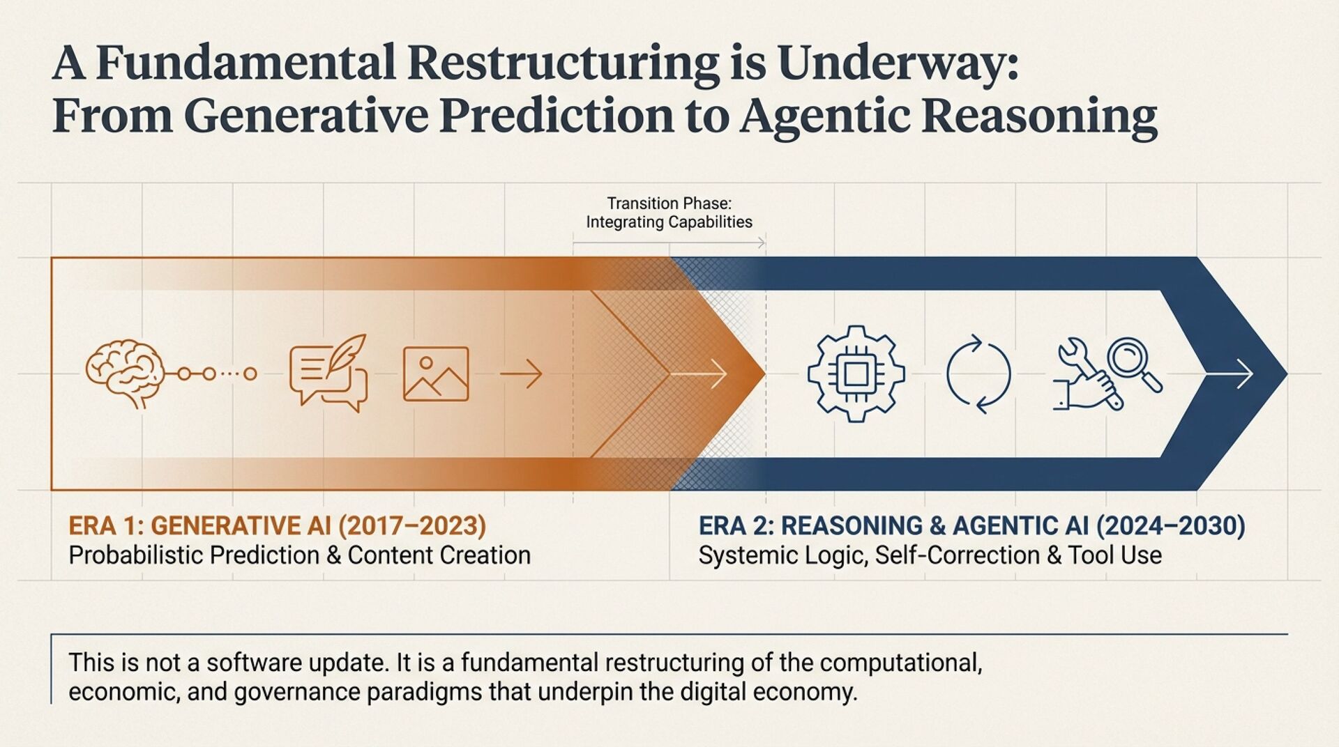 This strategic research report argues that AI progress is not linear. It moves through phase transitions triggered when algorithmic ideas collide with hardware constraints. You are now entering the biggest shift since the 2012 deep learning reboot, the move from Generative AI (2017–2023), focused on probabilistic content generation, to Reasoning and Agentic AI (2024–2030), where systems execute multi-step logic, self-correct, and use tools autonomously.